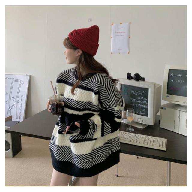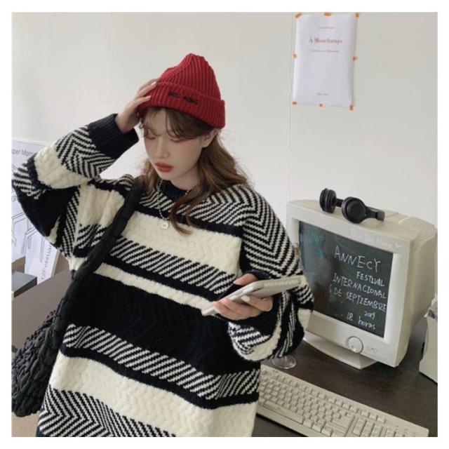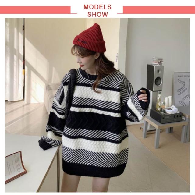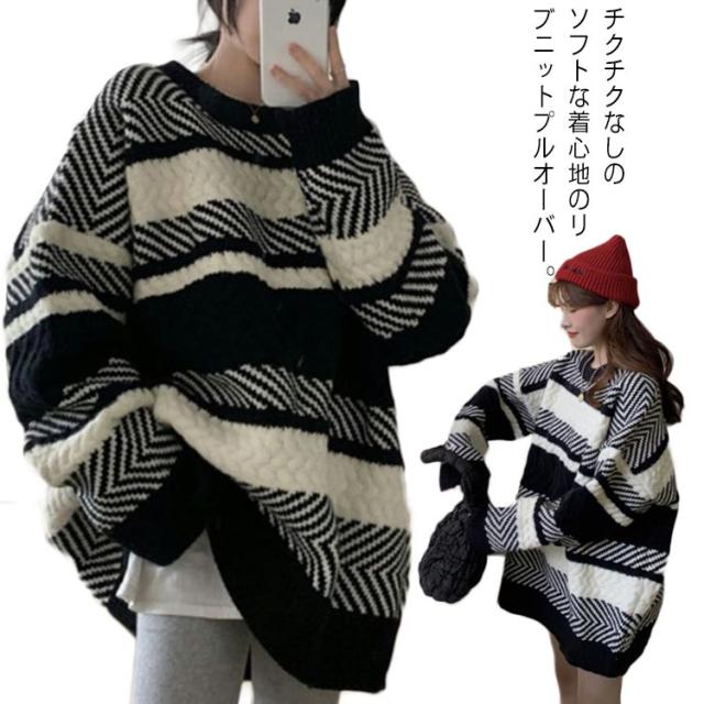 ニット レディース ケーブルニット セーター 長袖 無地 ボーダー クルーネック ランダムボーダー リブニット ニットトップス プルオーバー セーター 丸首 ボーダー柄 ドロップショルダー 大きめ ゆったり マルチボーダー ニットソー
