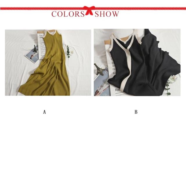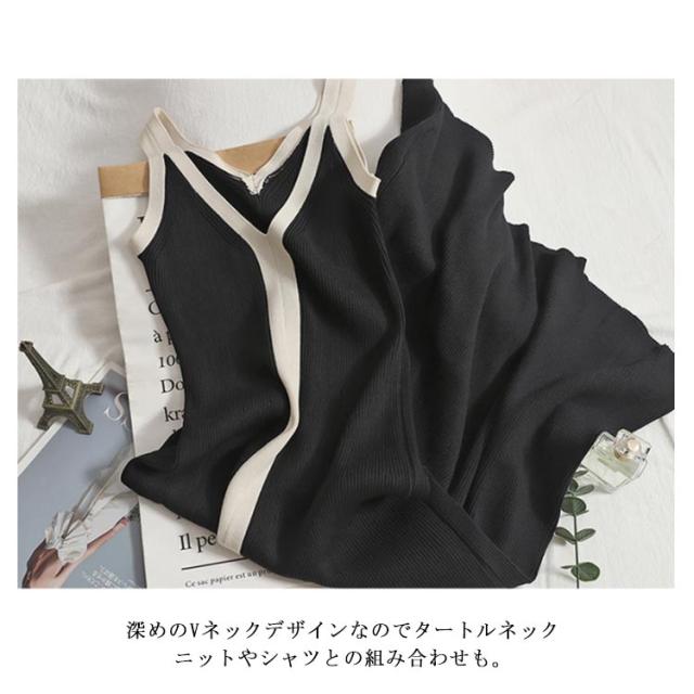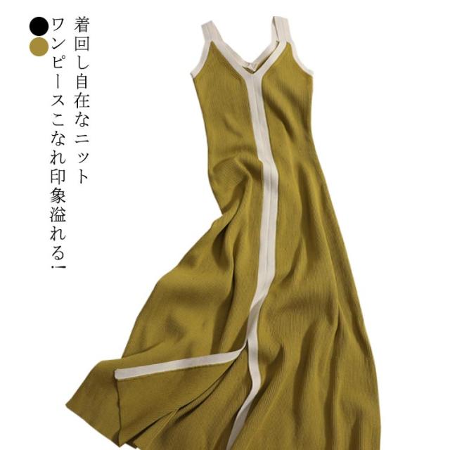 リブニットワンピース リブニット ミモレ ワンピース Vネック リボン スリット入り ノースリーブ キャミワンピース ニット ワンピ キャミソール ロング丈 無地 リブ編み ロングワンピース ニットワンピ 春 夏 秋 冬 シンプル 無地