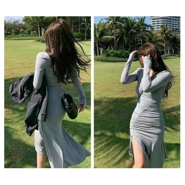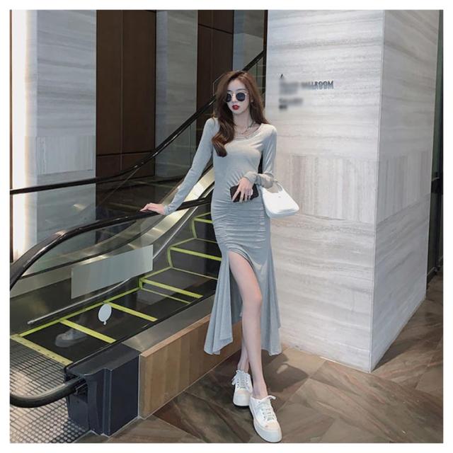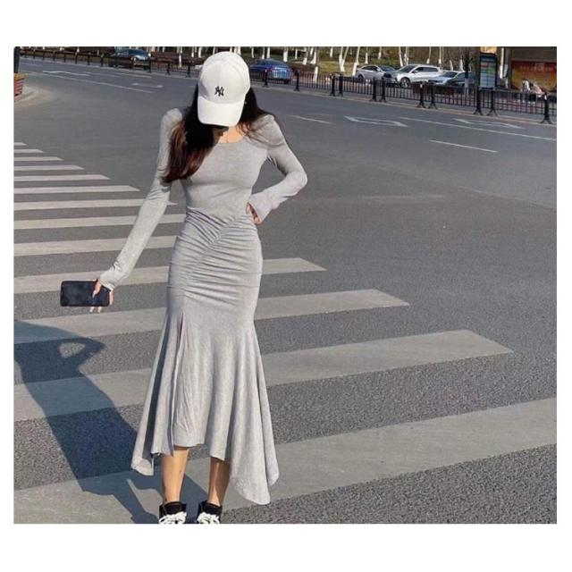 マーメイドスカート マーメイドワンピース 長袖 スリット入り タイトワンピース フレアワンピース ロングワンピース ロングワンピ aラインワンピース ブラック 黒 グレー 灰