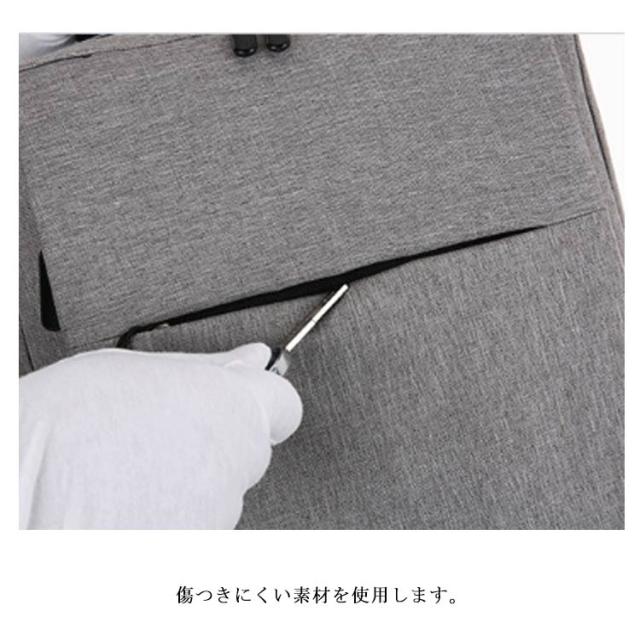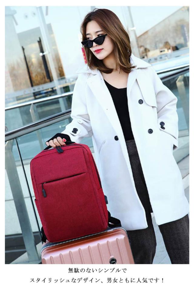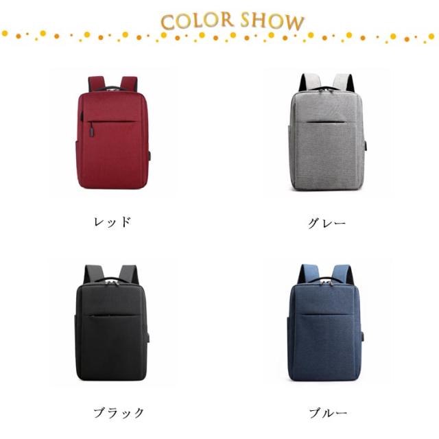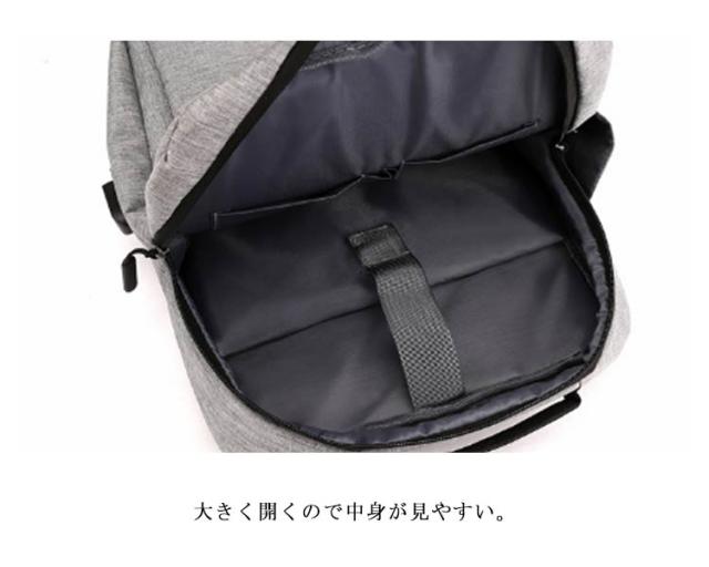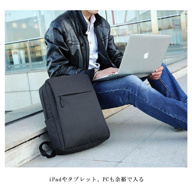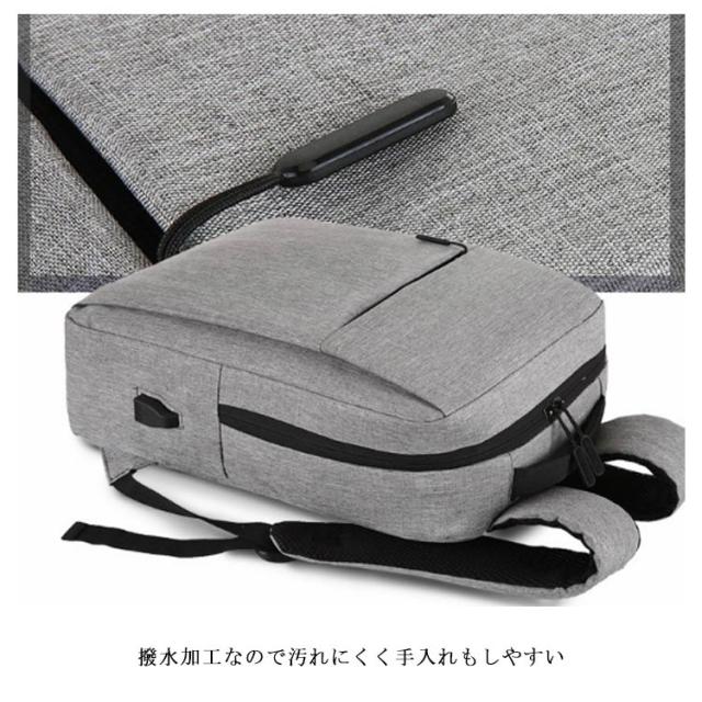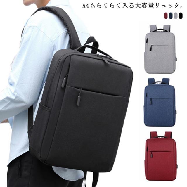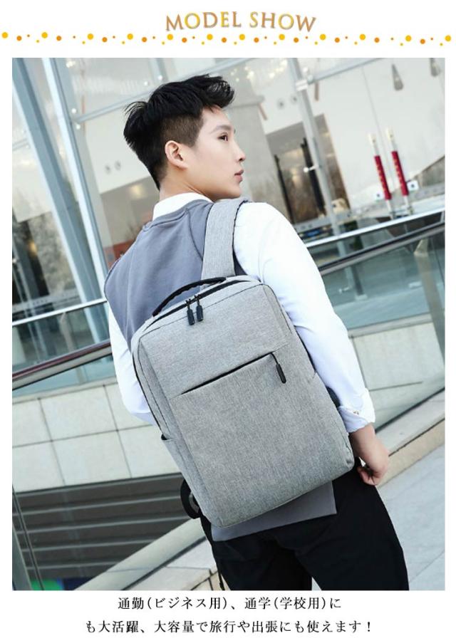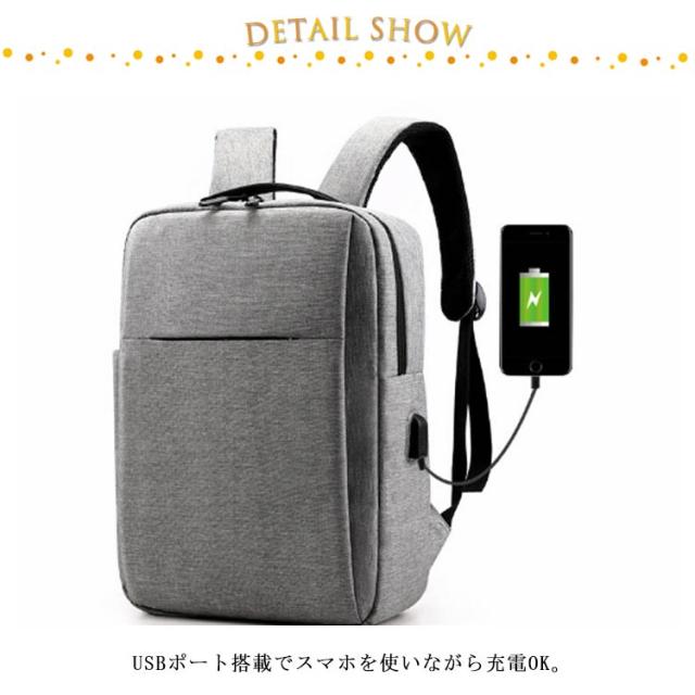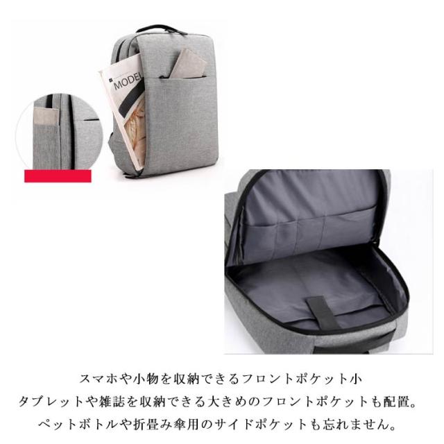 | A4もらくらく入る大容量リュック。 大きく開くので中身が見やすい。 スマホや小物を収納できるフロントポケット小 タブレットや雑誌を収納できる大きめのフロントポケットも配置。 ペットボトルや折畳み傘用のサイドポケットも忘れません。 撥水加工なので汚れにくく手入れもしやすい 傷つきにくい素材を使用します。 USBポート搭載でスマホを使いながら充電OK。 肩ベルトはクッション性◎で疲れにくい 耐久性のあるファスナーは壊れにくい 持ち手もしっかりした素材で破れにくい iPadやタブレット、PCも余裕で入る 通勤(ビジネス用)、通学(学校用)にも大活躍、大容量で旅行や出張にも使えます! 無駄のないシンプルでスタイリッシュなデザイン、男女ともに人気です! | |