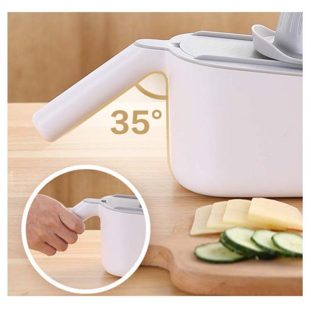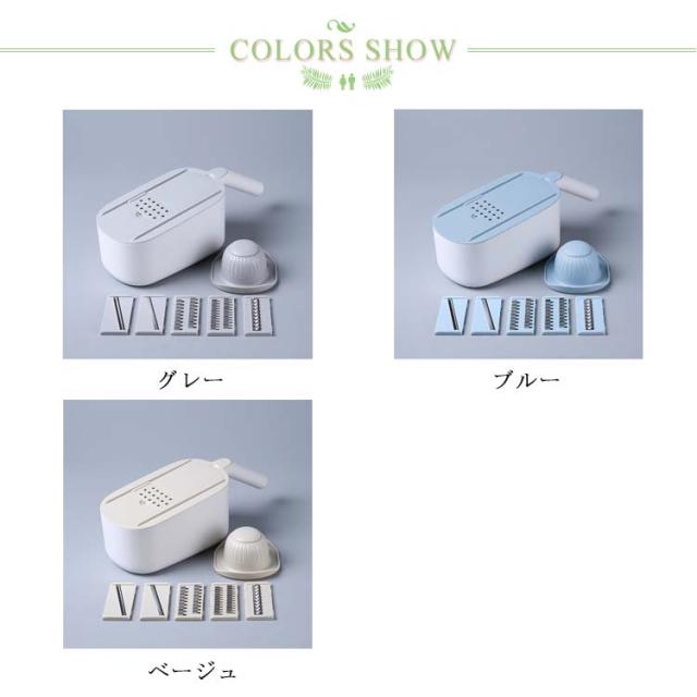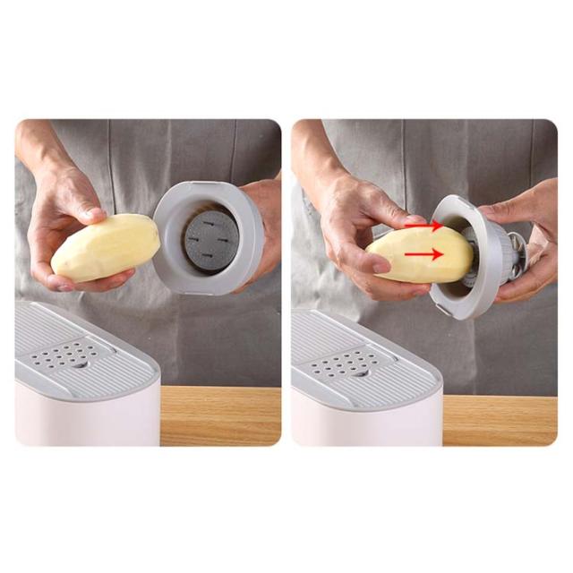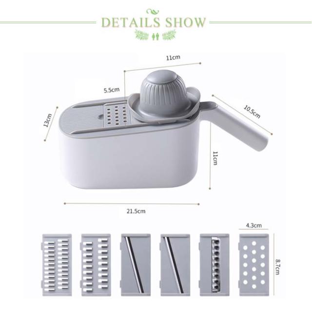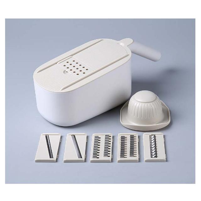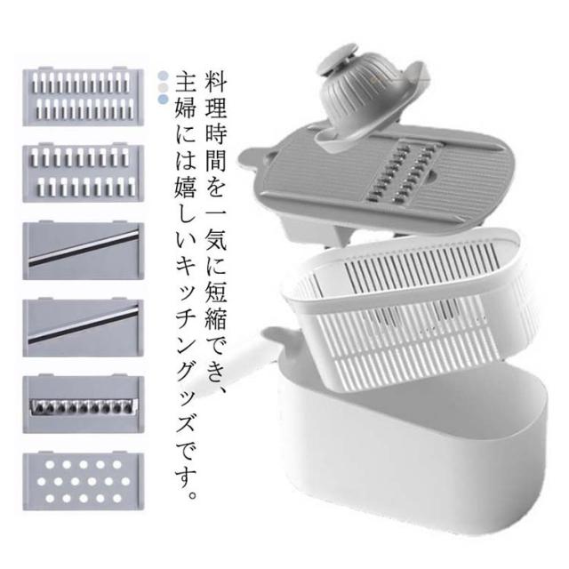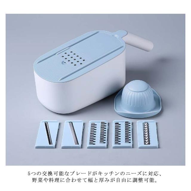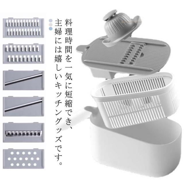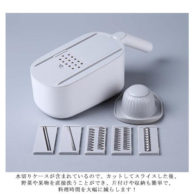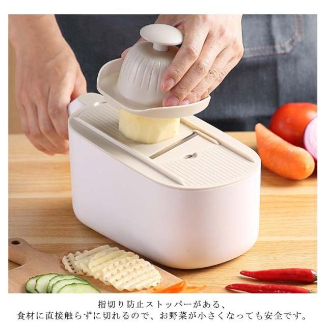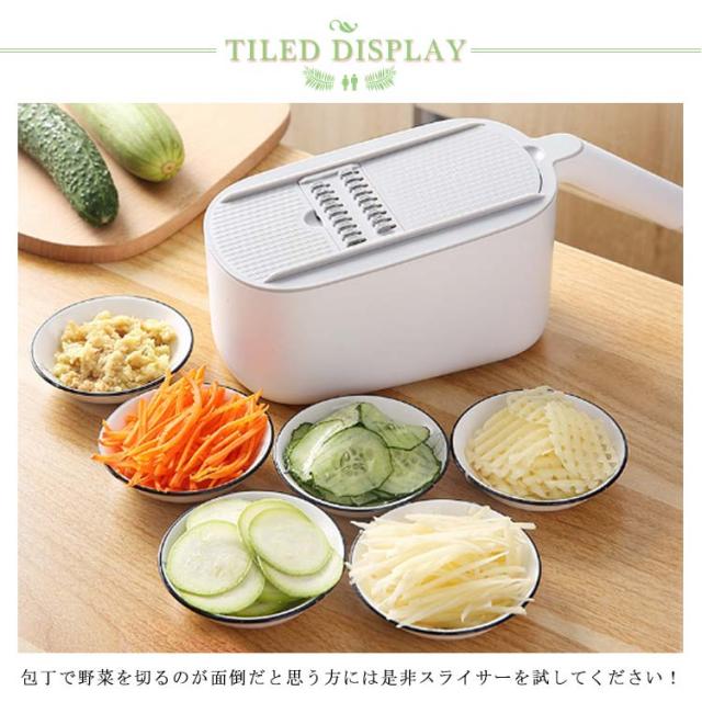 | 料理時間を一気に短縮でき、主婦には嬉しいキッチングッズです。 包丁で野菜を切るのが面倒だと思う方には是非スライサーを試してください! 指切り防止ストッパーがある、食材に直接触らずに切れるので、お野菜が小さくなっても安全です。 水切りケースが含まれているので、カットしてスライスした後、野菜や果物を直接洗うことができ、片付けや収納も簡単で、料理時間を大幅に減らします! 5つの交換可能なブレードがキッチンのニーズに対応、野菜や料理に合わせて幅と厚みが自由に調整可能。 使わないブレードは横に差し込んで収納できます。 受け皿の底には滑り止めがついていて、調理台の上でずれることなく安定感があります。 | |