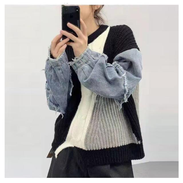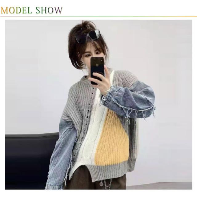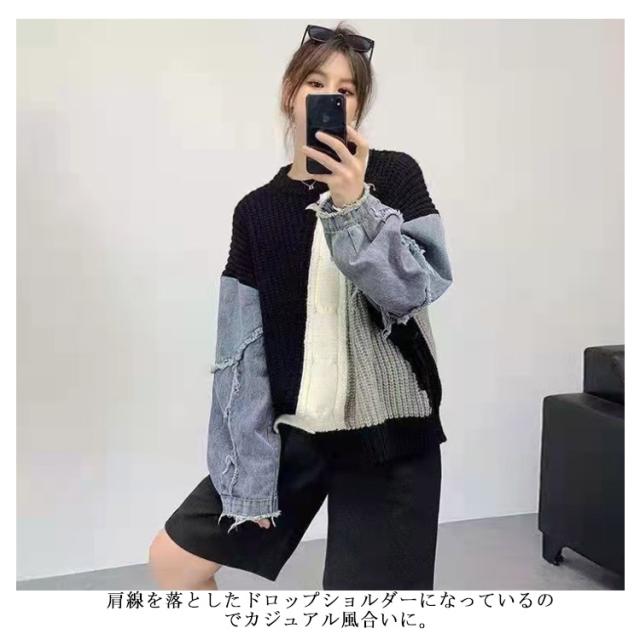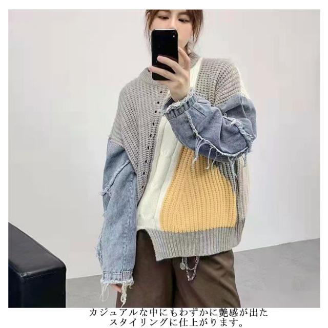 デニム ニット プルオーバー セーター レディース デニム トップス 切り替え ニットセーター クルーネック 長袖 秋冬 デニムコンビ リブ編み アシンメトリー シャギー 切替 配色 ダメージ加工 ローゲージ ニット