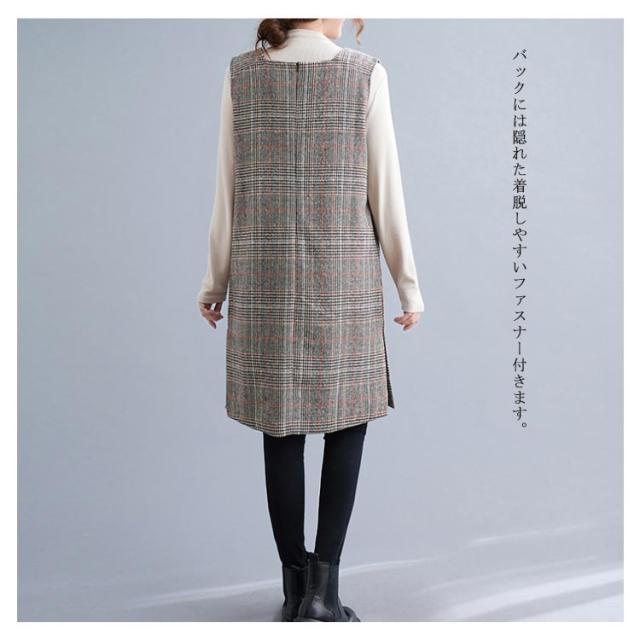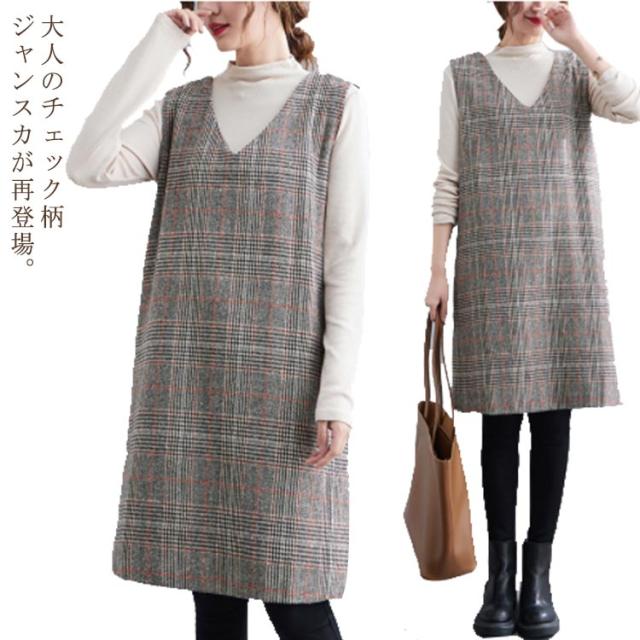 ワンピース グレンチェック 春秋 秋冬 重ね着 ジャンパースカート 膝丈 チュニック ジャンスカ スリット チェック柄 vネック レイヤード 可愛い ゆったり 体型カバー カジュアル フォーマル 20代 30代 40代 50代