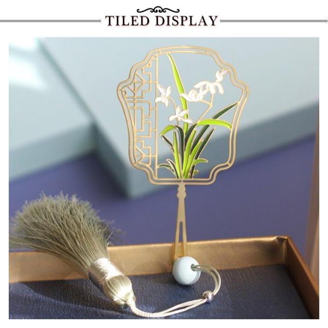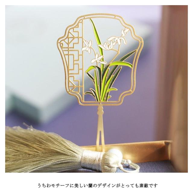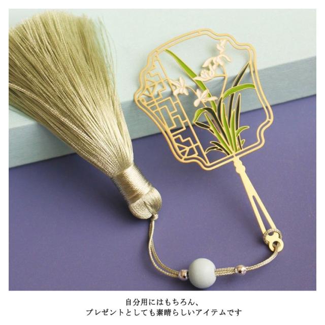 しおり 蘭 透かし模様のうちわ型 美しい植物 花のしおり タッセル付き 金属製 ゴールドカラー 文房具 事務用品 プチギフト プレゼント 送料無料