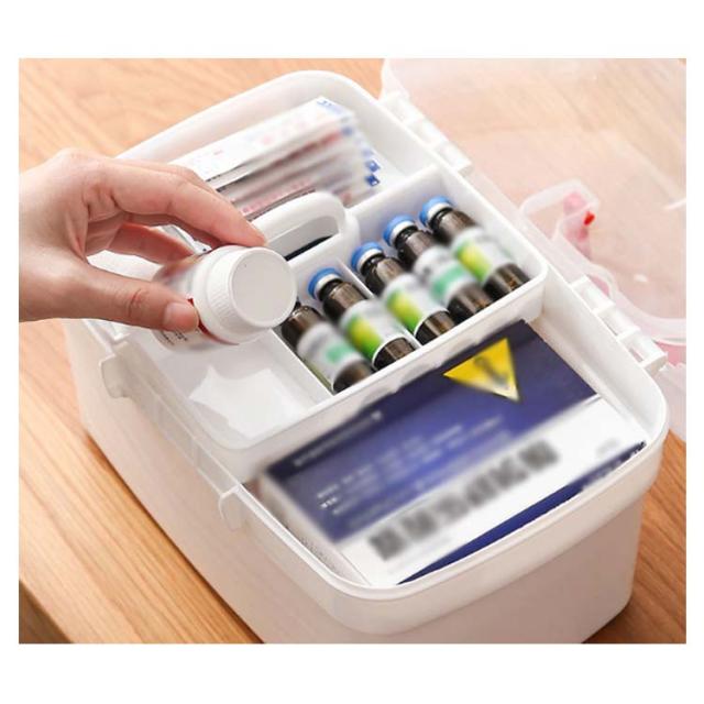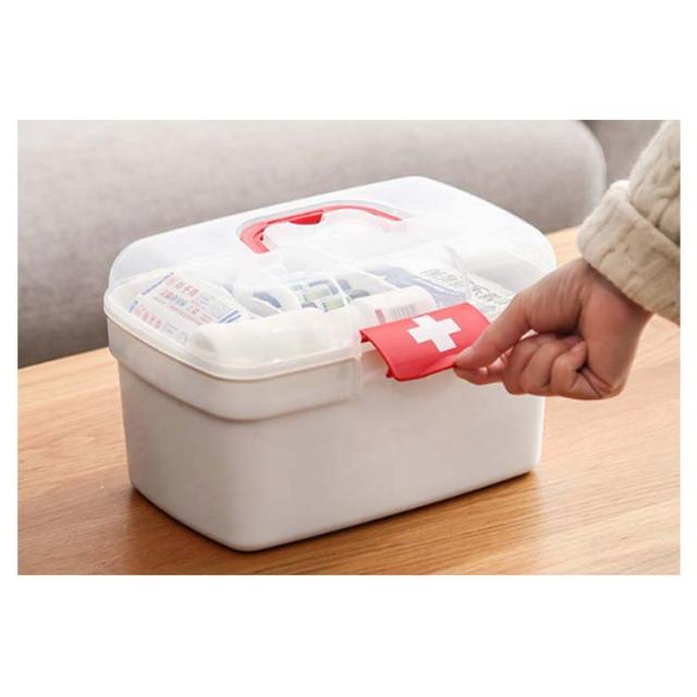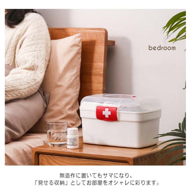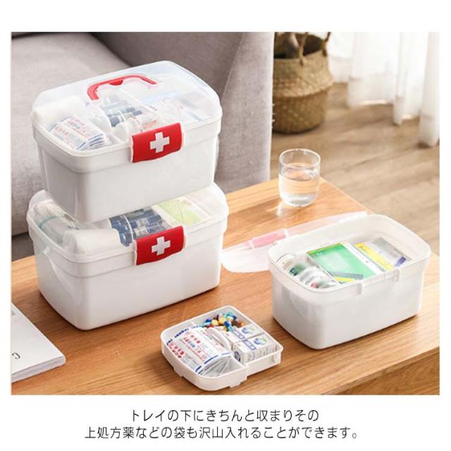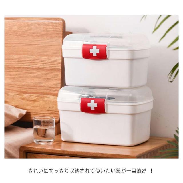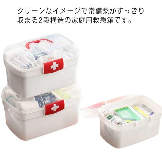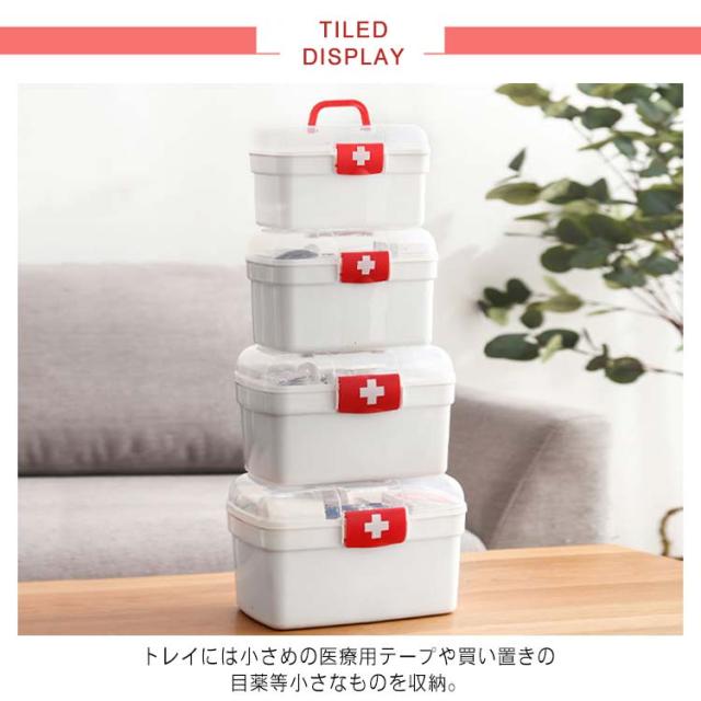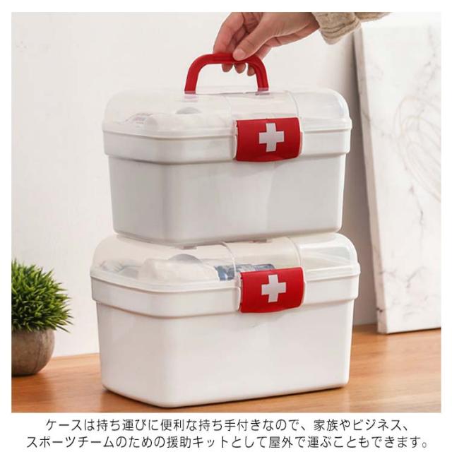 | クリーンなイメージで常備薬かすっきり収まる2段構造の家庭用救急箱です。 トレイには小さめの医療用テープや買い置きの目薬等小さなものを収納。 トレイの下にきちんと収まりその上処方薬などの袋も沢山入れることができます。 きれいにすっきり収納されて使いたい薬が一目瞭然 ! 無造作に置いてもサマになり、「見せる収納」としてお部屋をオシャレに彩ります。 ケースは持ち運びに便利な持ち手付きなので、家族やビジネス、スポーツチームのための援助キットとして屋外で運ぶこともできます。 しっかりロックで丈夫な入れの物なのでいざというときに備えて保管にピッタリのケースです。 | |