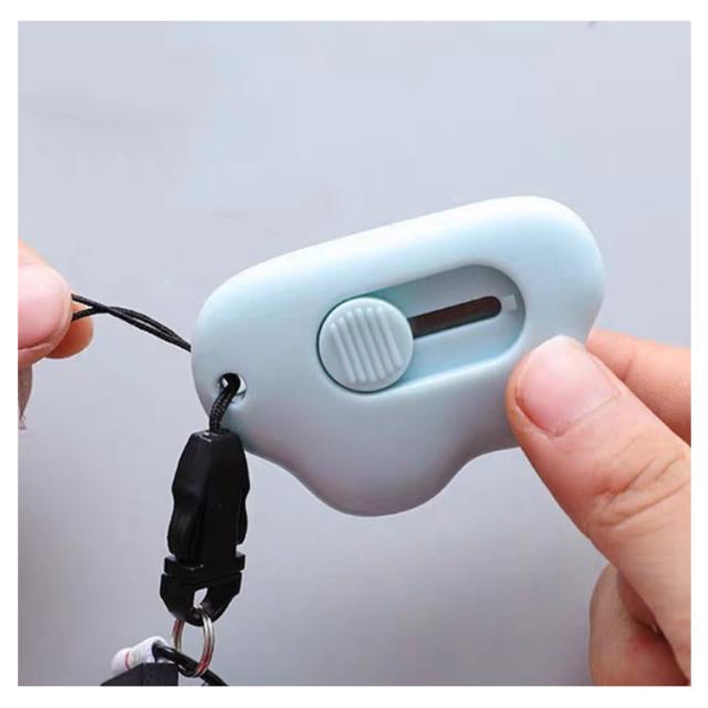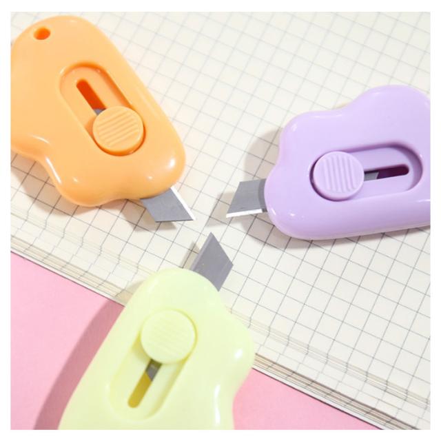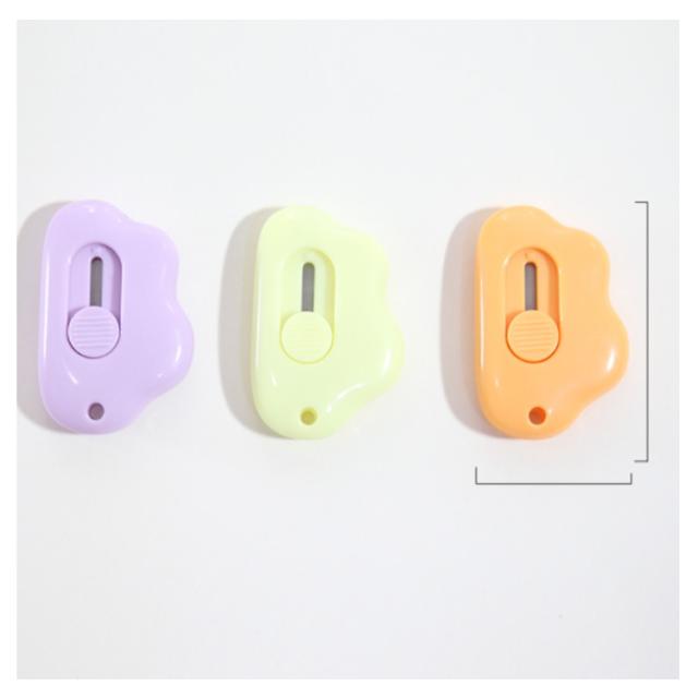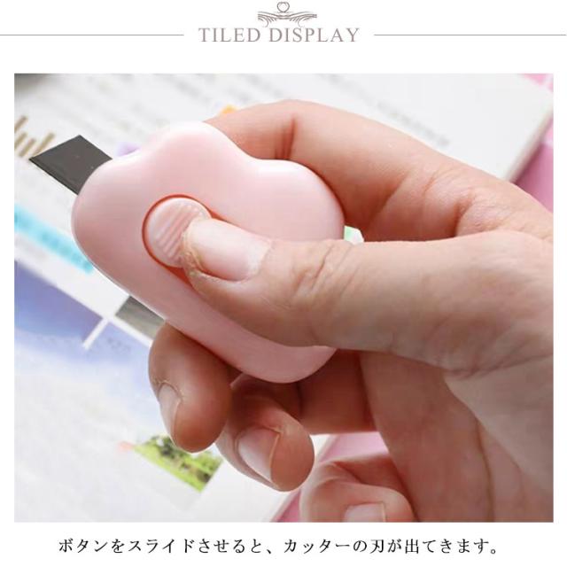 | くものデザインをした、かわいいミニカッターです。 ボタンをスライドさせると、カッターの刃が出てきます。 刃が短いので、書類や段ボールの中身を傷つけずに開封することができます。 手のひらにすっぽりおさまる握りやすい形状で気軽に使いやすい。 小型サイズなので筆箱に入れて持ち運びにも便利。 | |