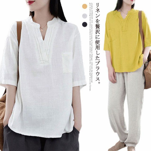 リネンブラウス リネンシャツ シャツ 麻 天然素材 レディース 五分袖 半袖 トップス チュニック ミセス ファッション 30代 40代 50代