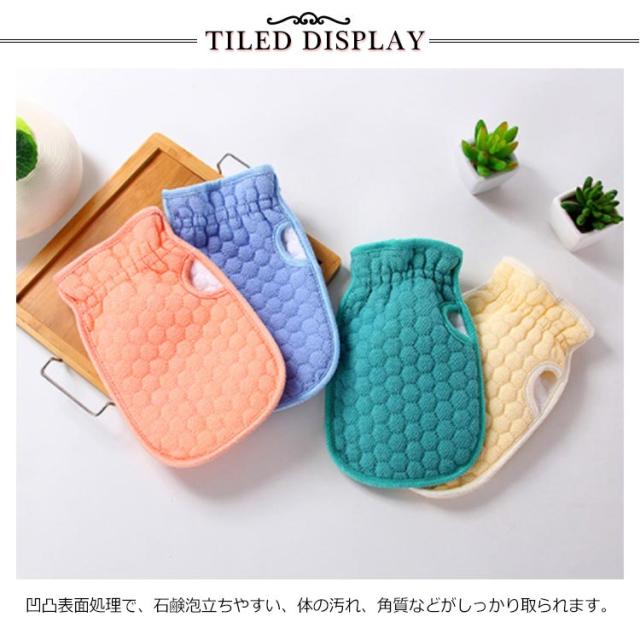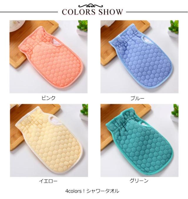 | 4colors!シャワータオル 凹凸表面処理で、石鹸泡立ちやすい、体の汚れ、角質などがしっかり取られます。 スポンジが入れてあるので柔らかくて手触り感優しい。 滑り止めゴム袖口しっかり手をつかむ! 手袋型なので、普通のタオルよりもっと便利です。 普段使いはもちろん、病院の介護用品としては大活躍! | |