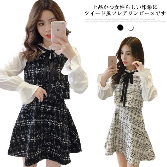 異素材スリーブ ツイード ワンピース リボンタイ付き フリルワンピース 切り替え フェイクレイヤード 重ね着風 長袖 ボリュームスリーブ ツイードワンピ キャバ ドレス ミニワンピース 体型カバーブラック ホワイト Aライン 上品 フェミニン 送料無料