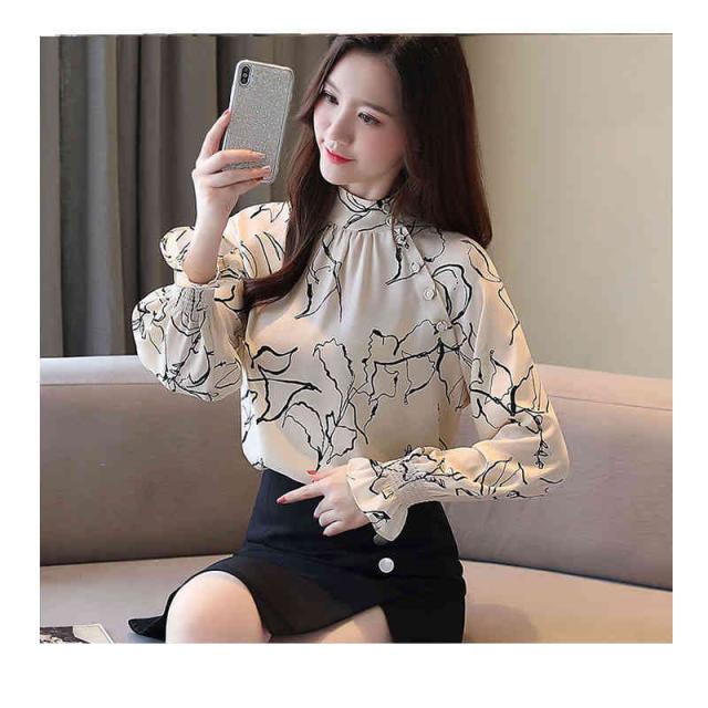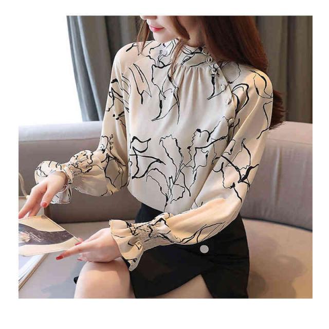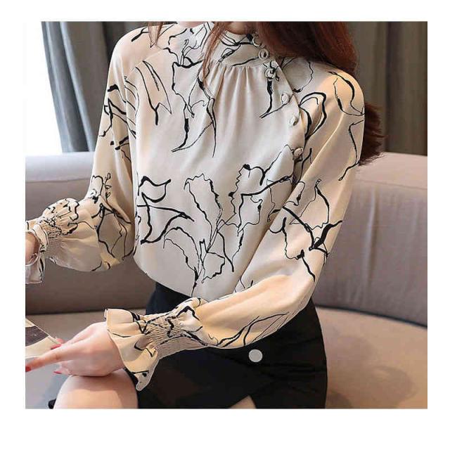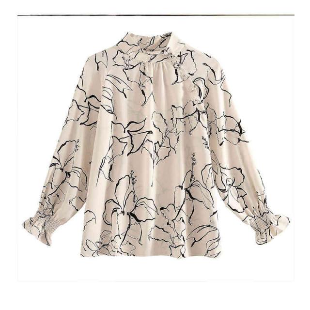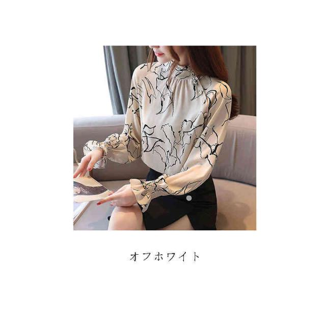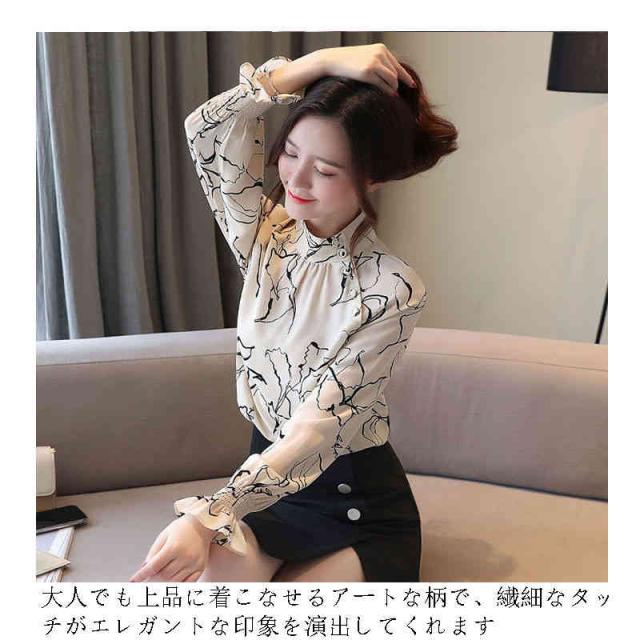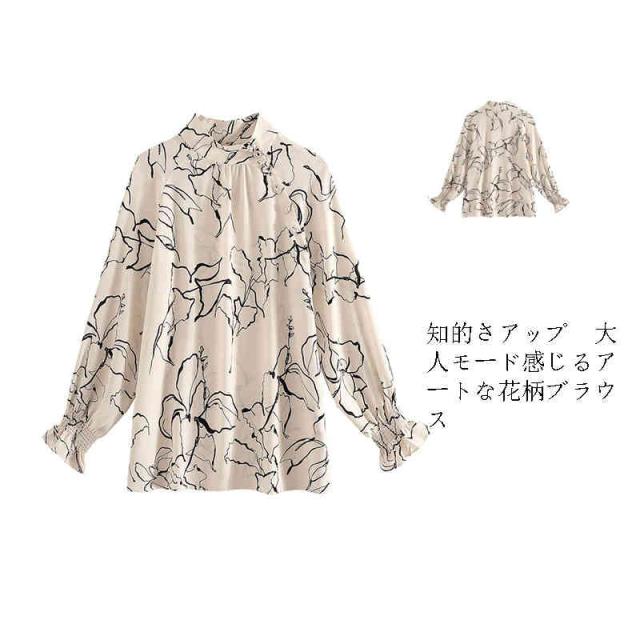 ブラウス 立ち襟 アートな花柄 レーディス 抽象柄 斜めボタン スタンドネック トップス 長袖 総柄 ギャザー 線画 春 夏 上品 エレガント 着回し 滑らか イージーケア おケーション オフィス フォーマル カジュアル 薄手