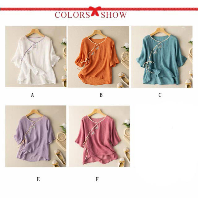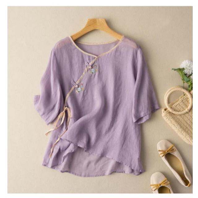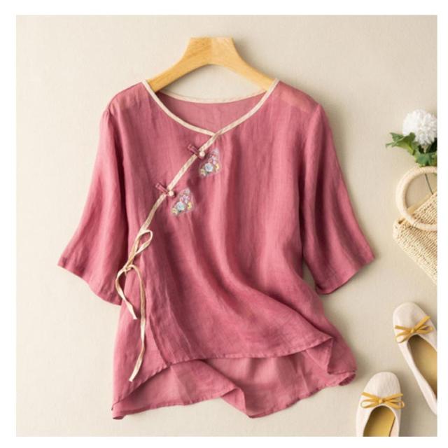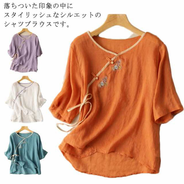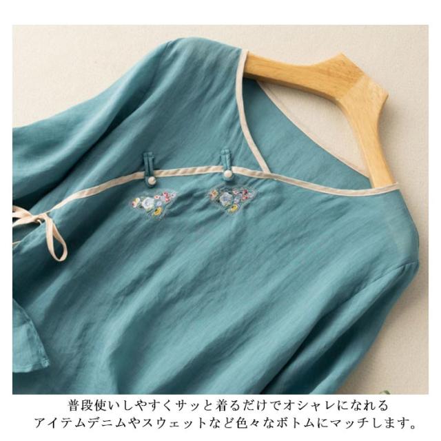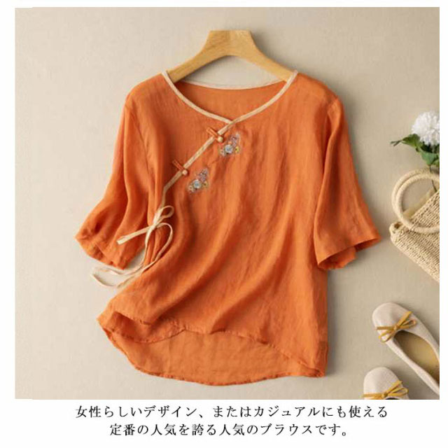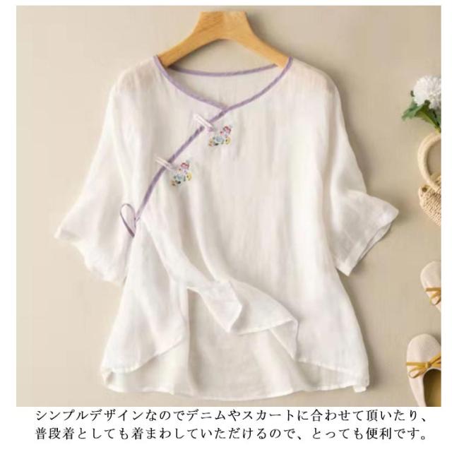 リネンブラウス チャイナボタン レディース 民族風 リネントップス 花柄 カジュアル 文芸 トップス シンプル 7分袖 半袖 春秋 春夏 Tシャツ ゆったり レトロ 復古 エレガント 送料無料