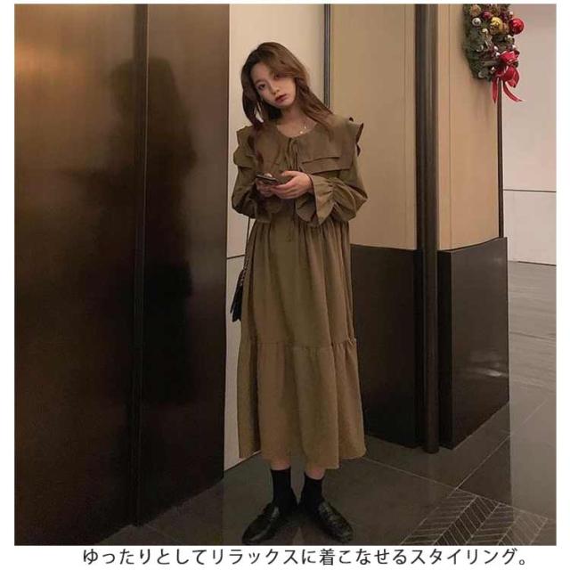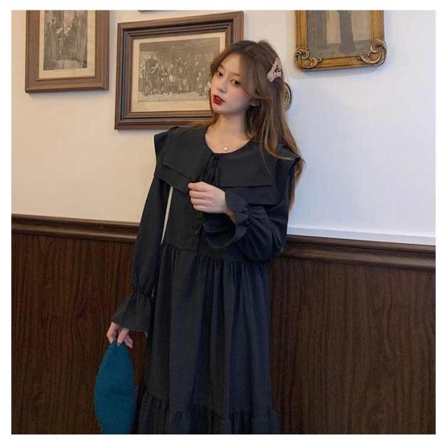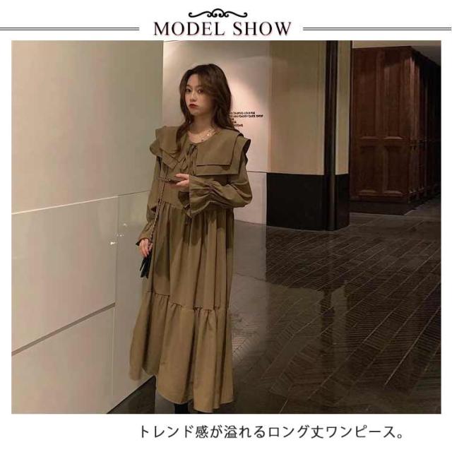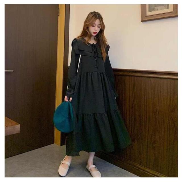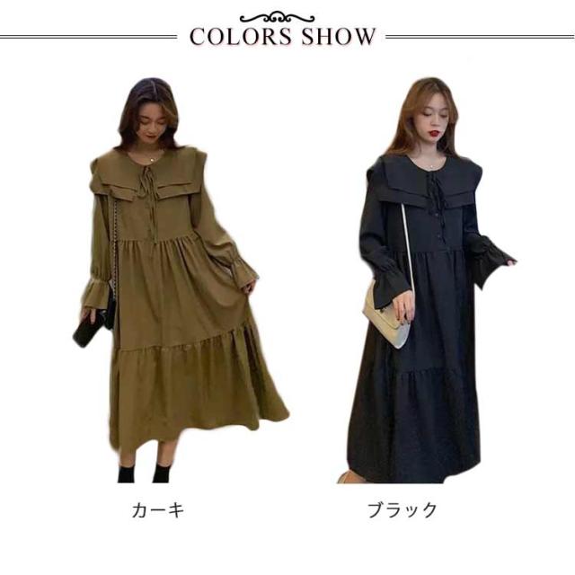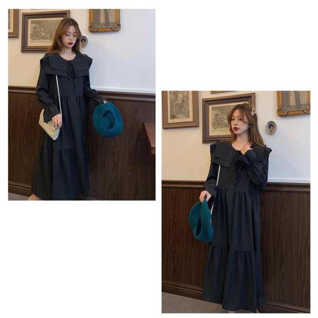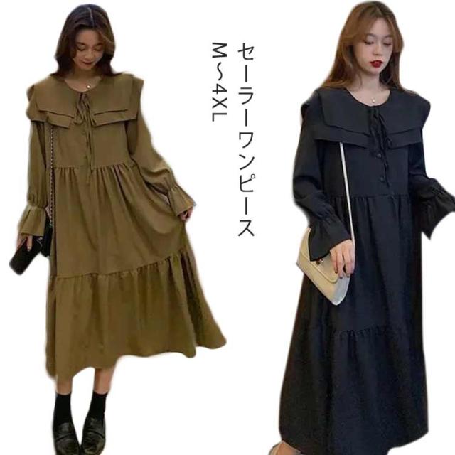 ワンピース トレンド ロング セーラーワンピース 海軍風 セーラー襟 長袖 フリル レディース 妊婦 マタニティ ブラック 可愛い ゆったり 大きいサイズ 爽やか 送料無料