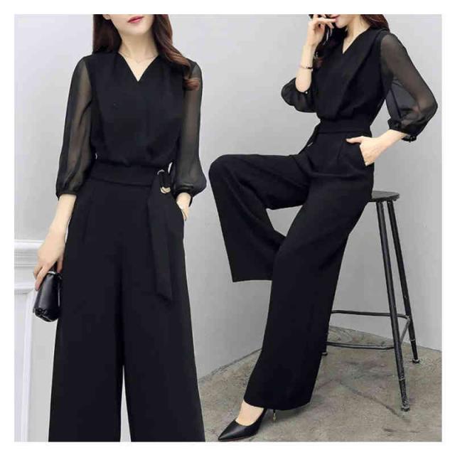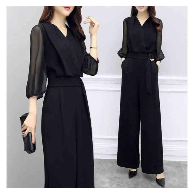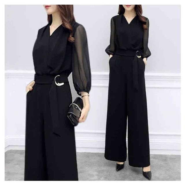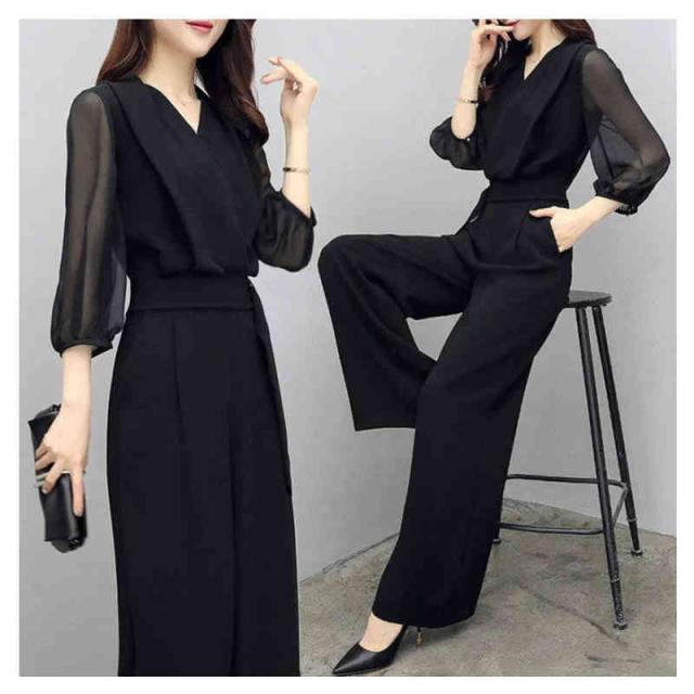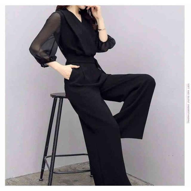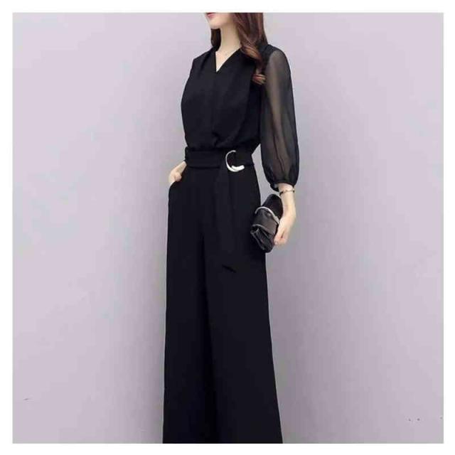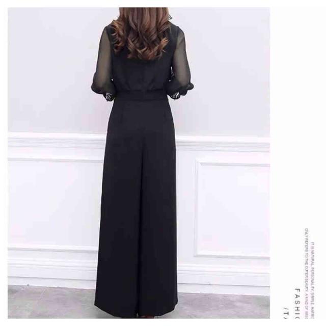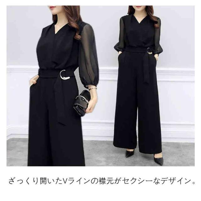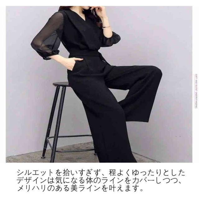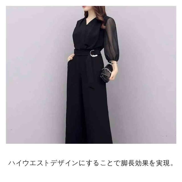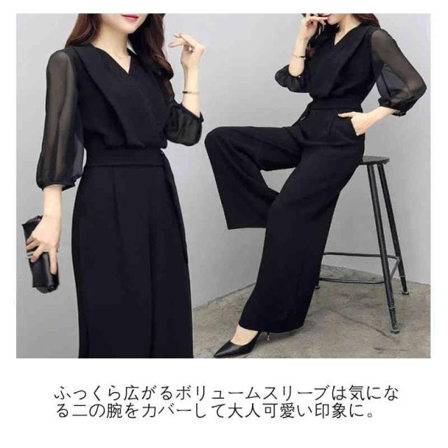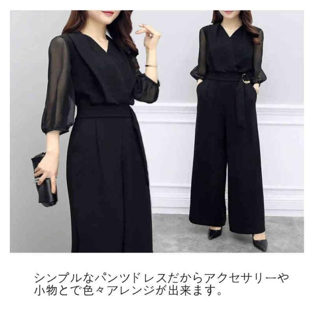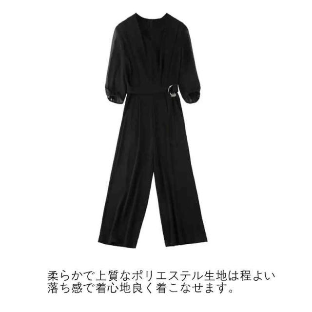 パンツドレス セットアップ レディース オールインワン パーティードレス ママスーツ ワイドパンツ パンツスーツ 七分袖 Vネック ベルト付き 大きいサイズ ロング丈 オフィスカジュアル フォーマル OL 通勤