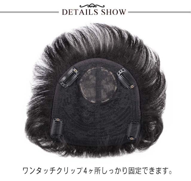 | 人毛100%で自然な光沢や質感となります。 ワンタッチクリップ4ヶ所しっかり固定できます。 通気性が良い、お肌にも刺激の少ない優しい素材を使用。 治療中の方にも安心してお使い頂けます。 | |