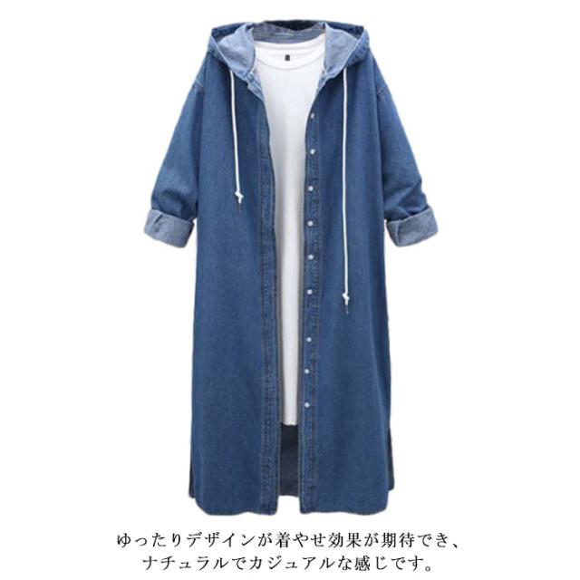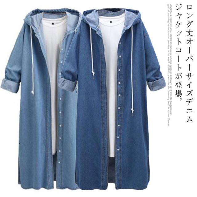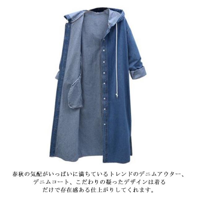 デニムジャケット デニムコート ロング丈 アウター デニムパーカー トレンチコート スプリングコート Gジャン ロングパーカー フード付き 羽織り カーディガン 体型カバー 通勤 通学 ゆったり オシャレ