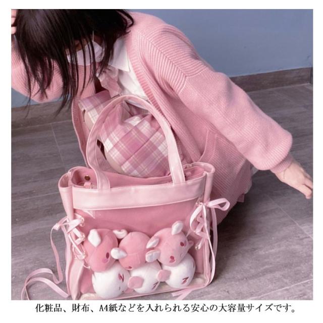 | お好きなデコレーションや缶バッジなど透明なポケット内側に付くことができます。 透明の部分はPVCの材質で、バッグの表はPUで、内側は帆布の材質で組み合わせます。 化粧品、財布、A4紙などを入れられる安心の大容量サイズです。 推し活、ライブ、イベント、普段のお出かけはすごく適用しています。 かわいいリボンも付いてますので、女の子の中で大人気です。 汚れにくい&汚れてもふき取りやすい仕様になっています。 | |