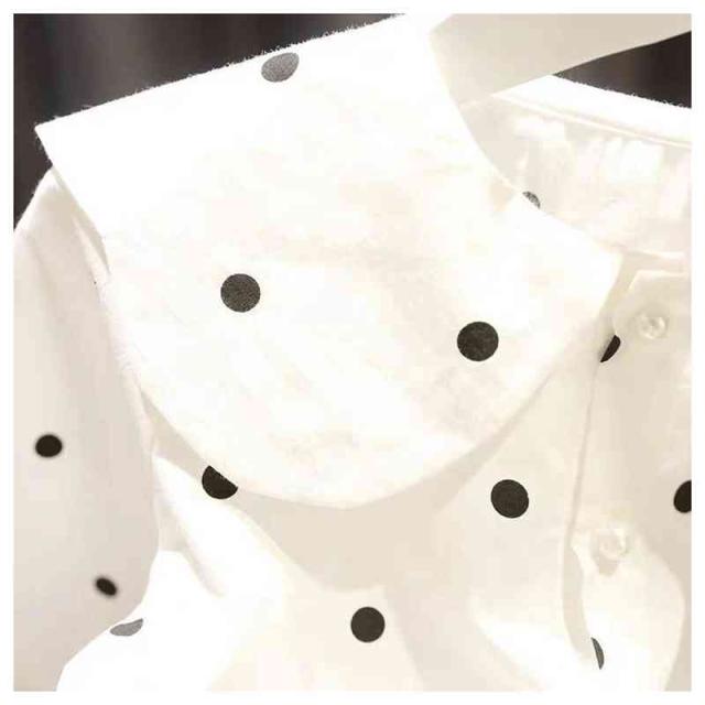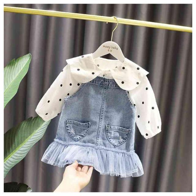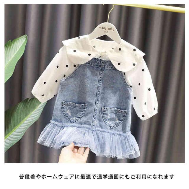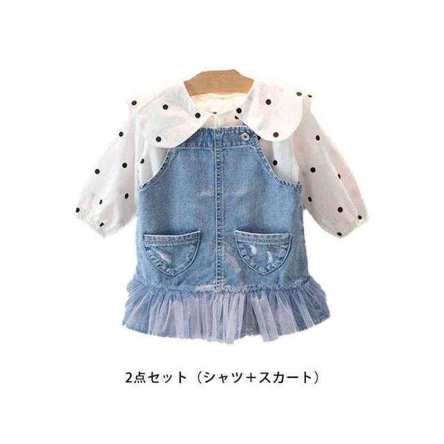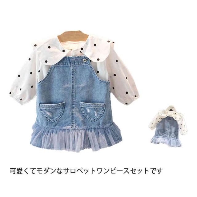 2点セット キッズ セットアップ ブラウス シャツ ワンピース サスペンダースカート ドット柄 デニム サロペット 子供服 長袖 ジュニア 女の子 ゆったり ジャンパースカート 体型カバー フォーマル