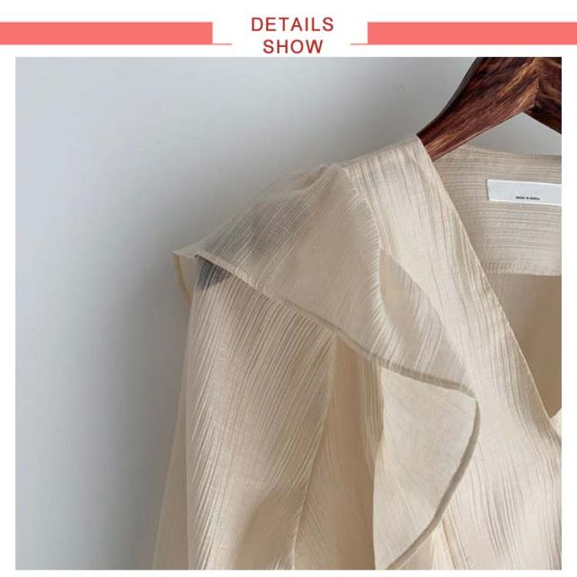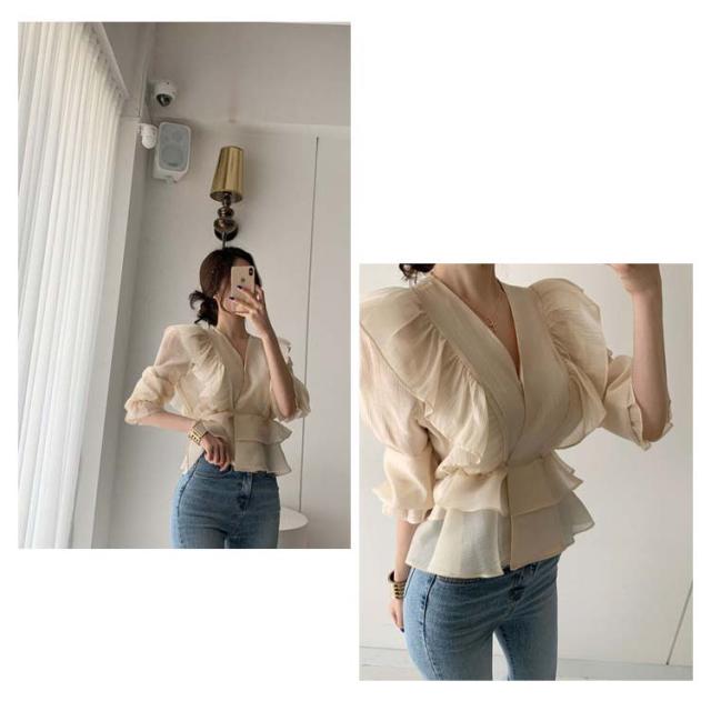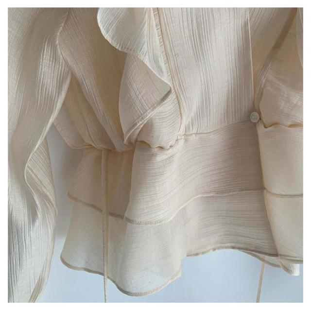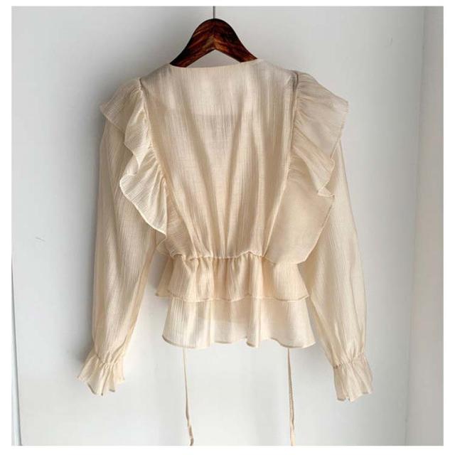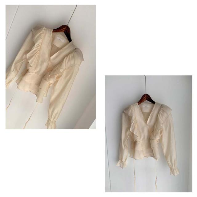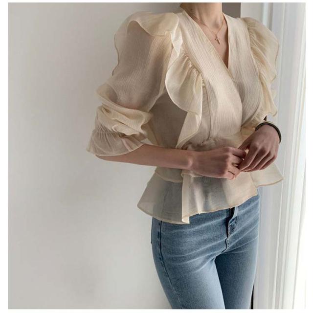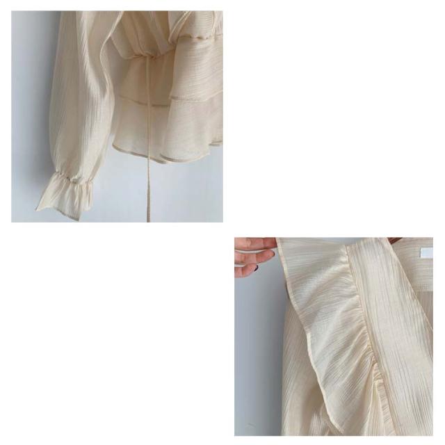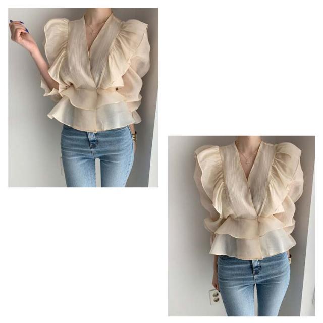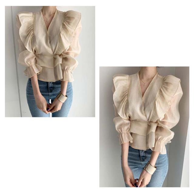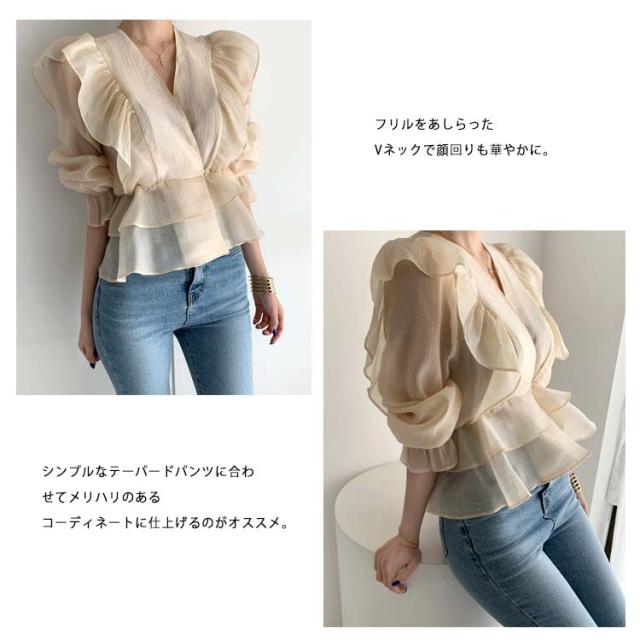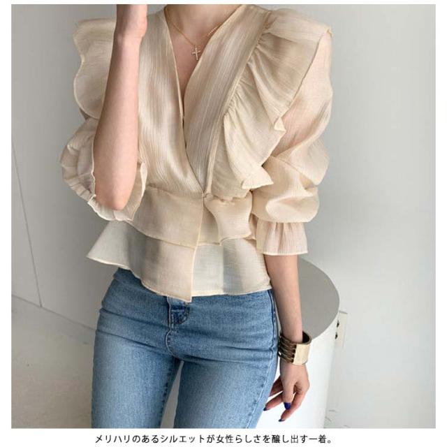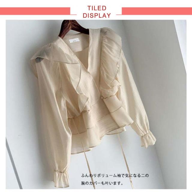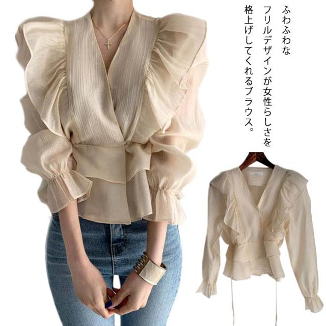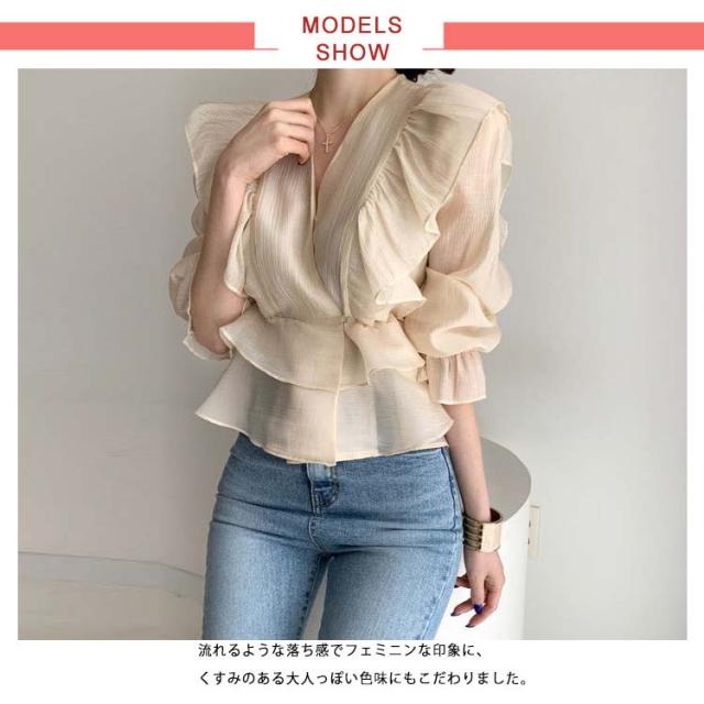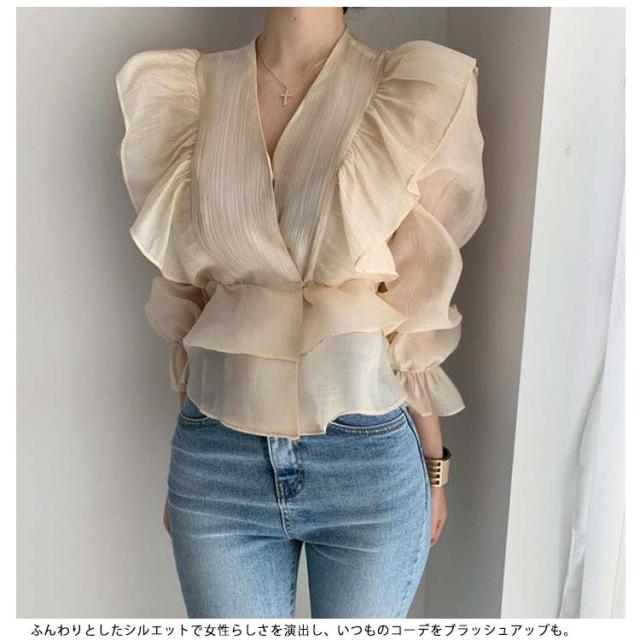 フリルブラウス トップス 長袖 フリルシャツ Vネック フレンチスリーブ ショート丈 無地 シースルー 透け感 ブラウスシャツ フリル フォーマル シャツ チュニックシフォン レイヤード オフィス 通勤 スーツ レディース 送料無料