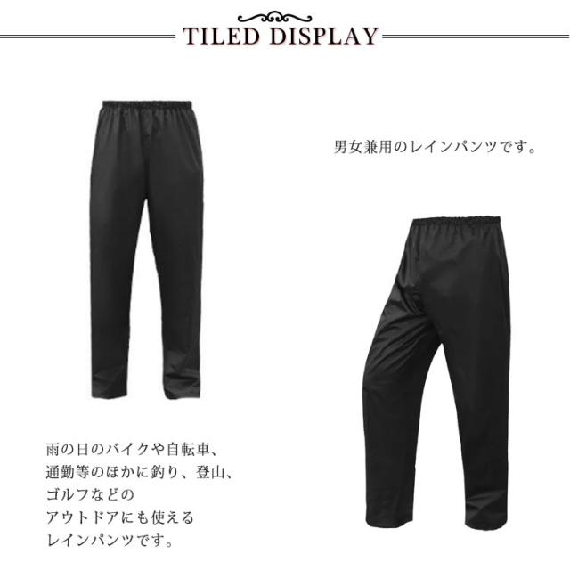 | 男女兼用のレインパンツです。 透湿防水素材を採用し、必要な透湿防水性とドライで快適な気心地を実現できます。 ウエストゴム仕様で履き脱ぎが楽で便利。 雨の日のバイクや自転車、通勤等のほかに釣り、登山、ゴルフなどのアウトドアにも使えるレインパンツです。 | |