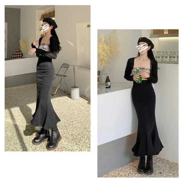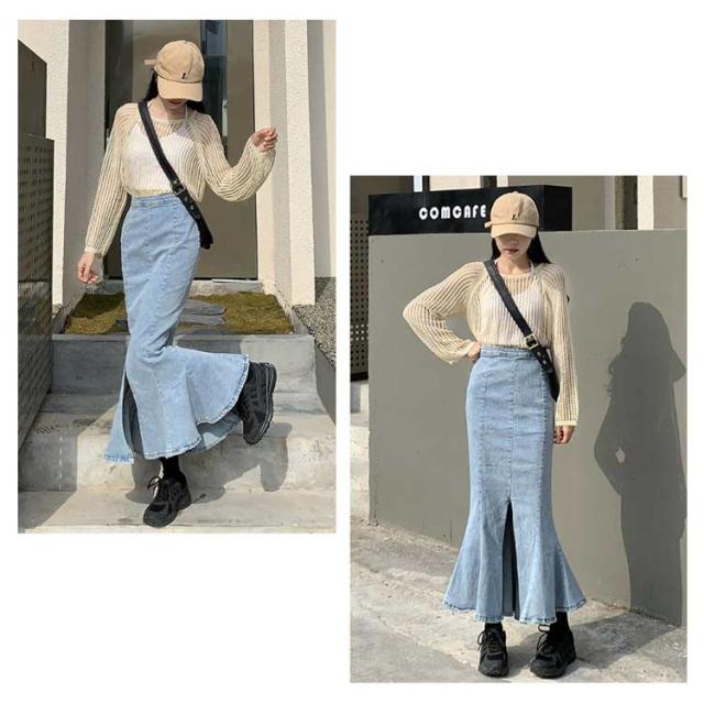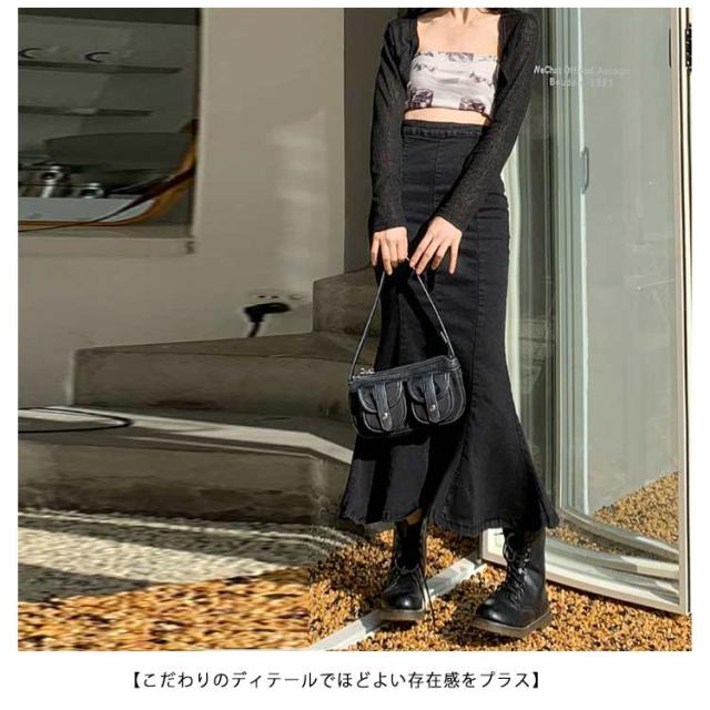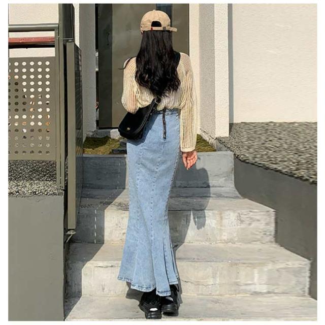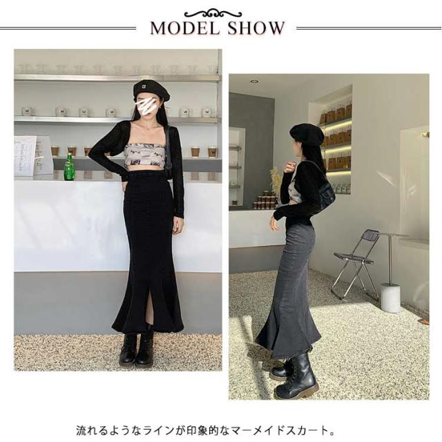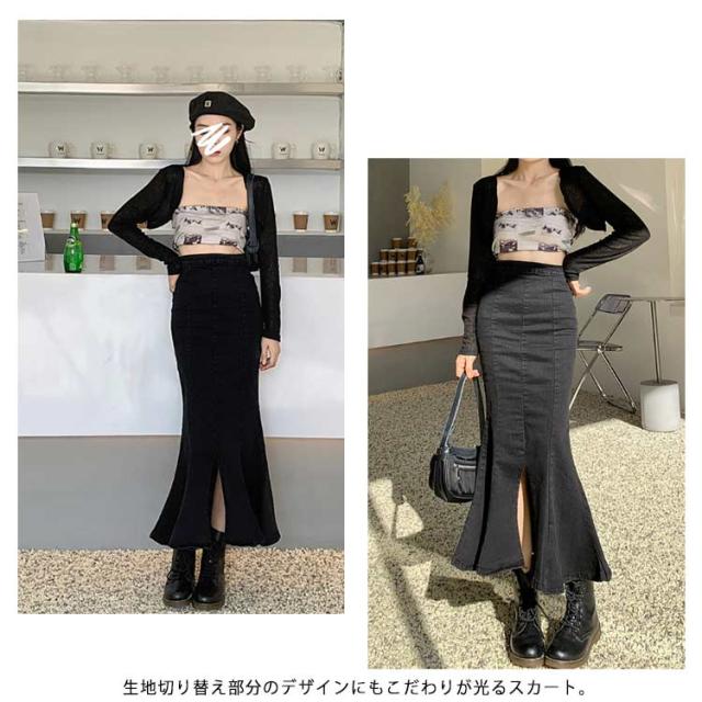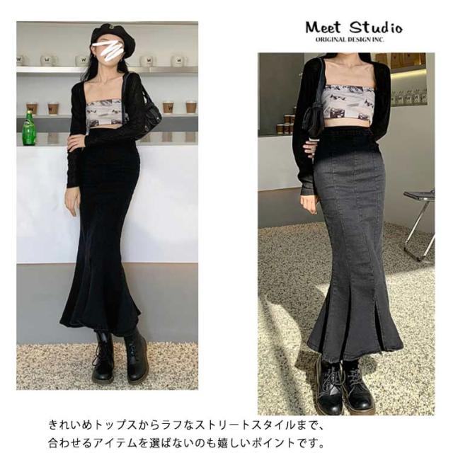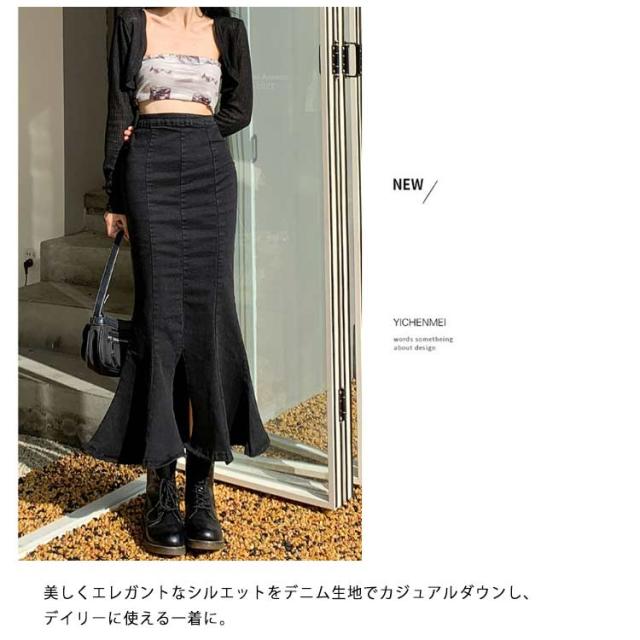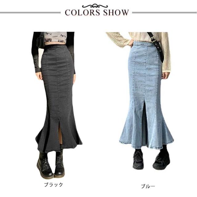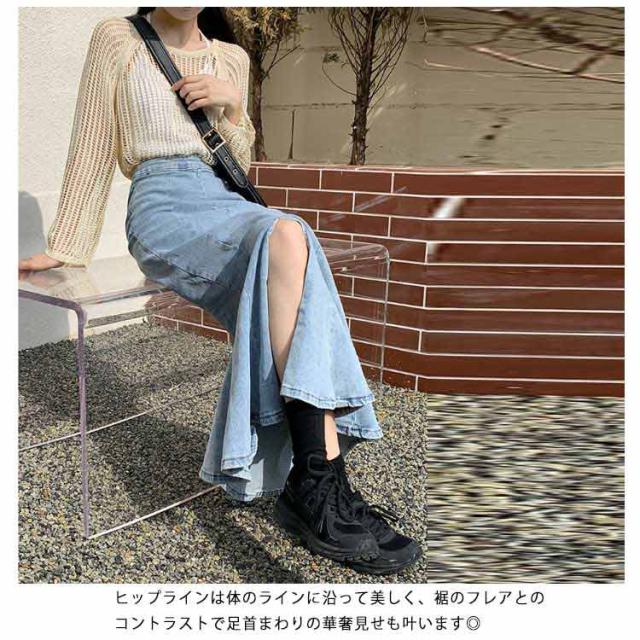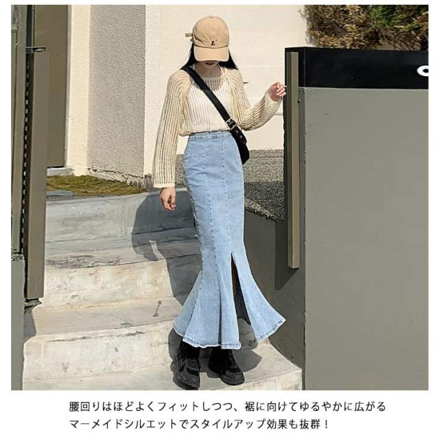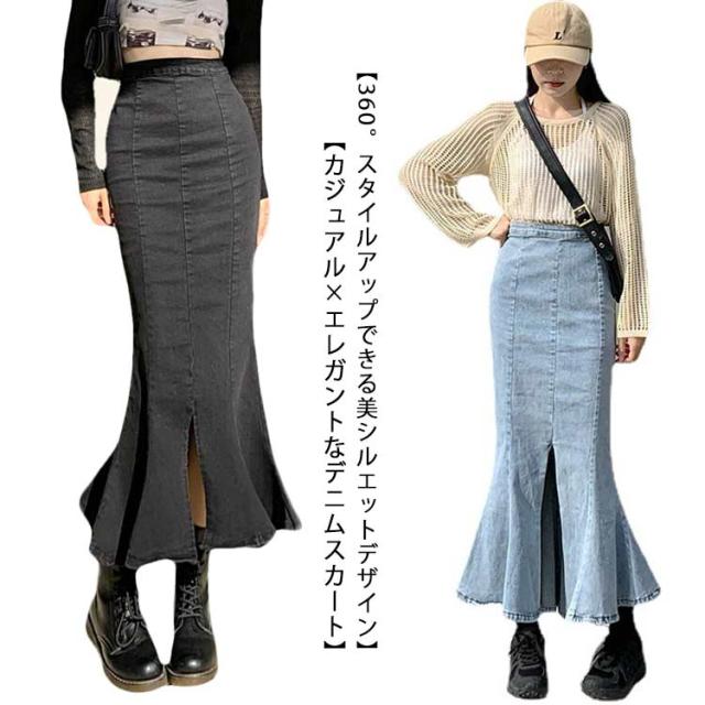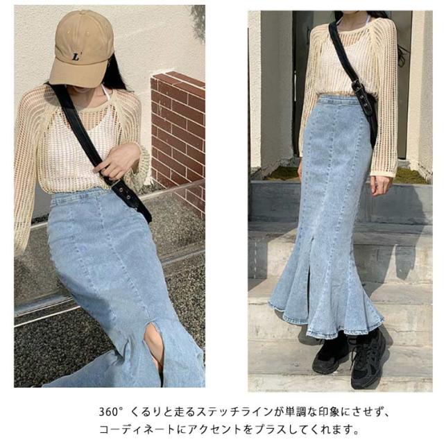 ワンピース マーメイドスカート フリル ロング おしゃれ かわいい レディース ボトムス きれい デニム マキシ丈 ミディアム丈 ハイウエスト フレアスカート タイト 春夏 秋 シンプル 無地 薄手 カジュアル モード キレカジ ストレッチ カットオフ 抜け感
