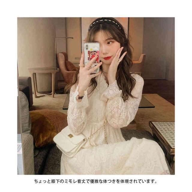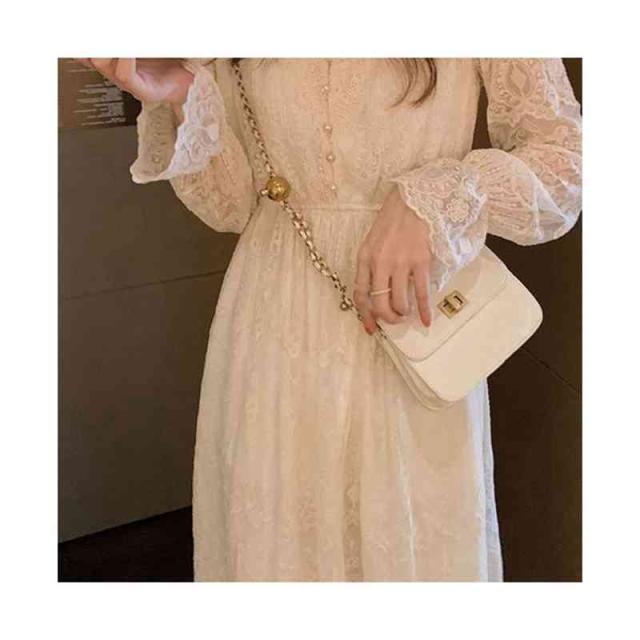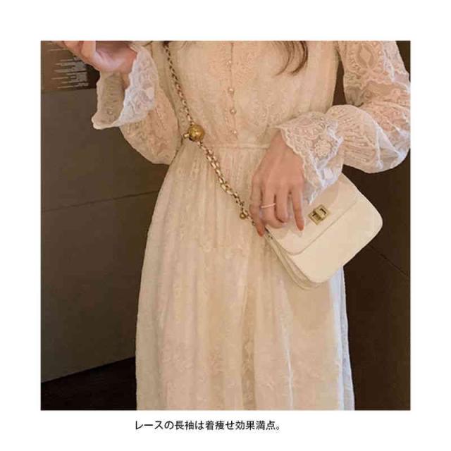 レディース ワンピース レース ドレス フリル 膝下丈 裏地付き プリンセス 花柄 可愛い 長袖 カジュアル 森ガール 春 秋 冬