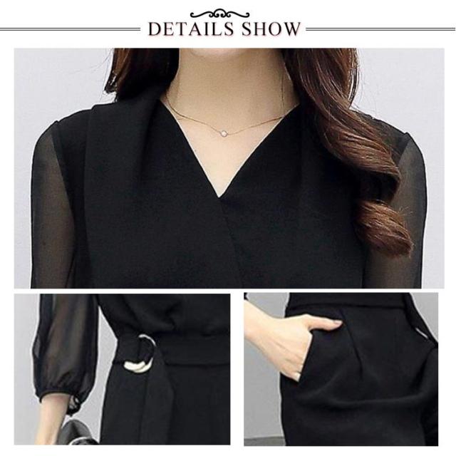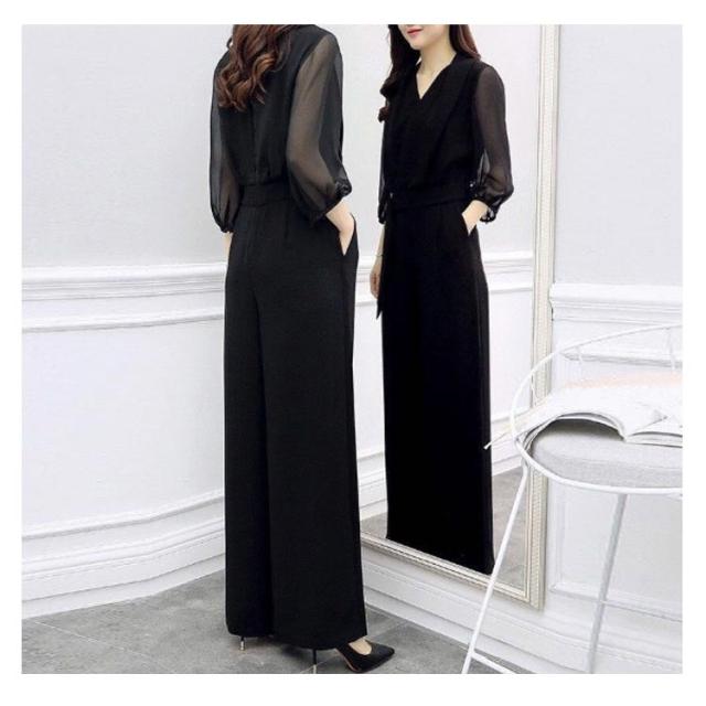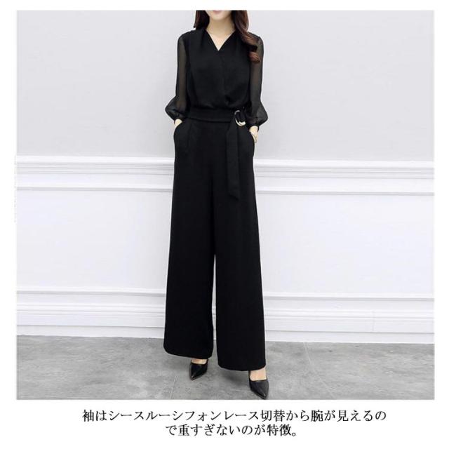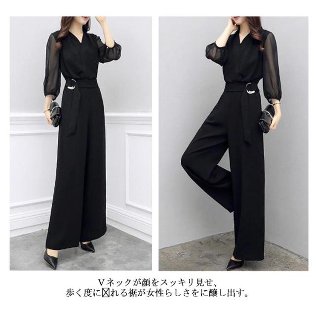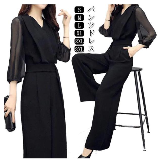 パンツドレス パーティードレス オールインワン ドレス ワイドパンツ レディース オーバーオール 袖あり 7分袖 結婚式 二次会 お呼ばれ 披露宴 無地 大きいサイズ 20代 30代 40代 ブラック 送料無料