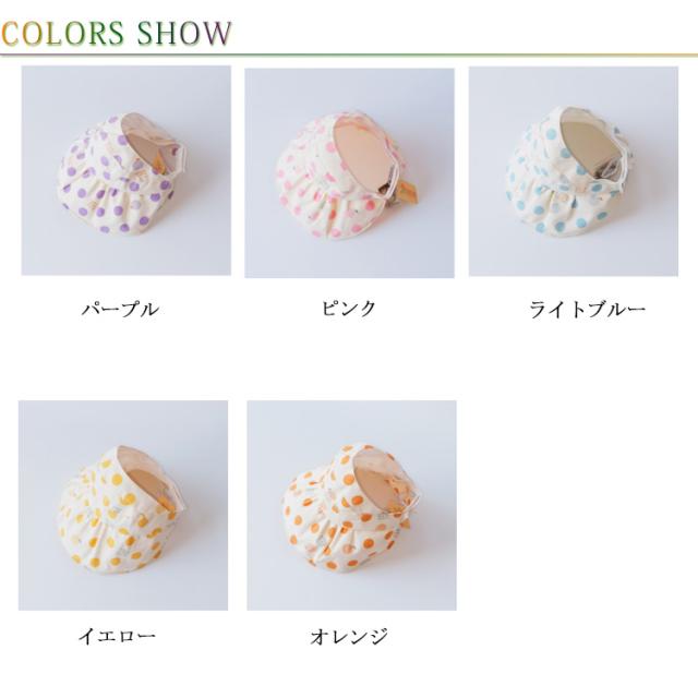 | ドット柄のかわいいつば広帽子。 選べる5色で、どんな服とも相性◎ マジックテープでサイズ調整可。 調整可能な顎ひも付き。 使わないときはコンパクトに折りたたみもでき持ち運びに便利♪ 通園・通学等の普段使いやお出掛け・旅行にも幅広く活躍! | |
