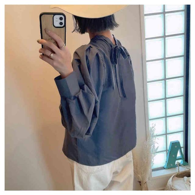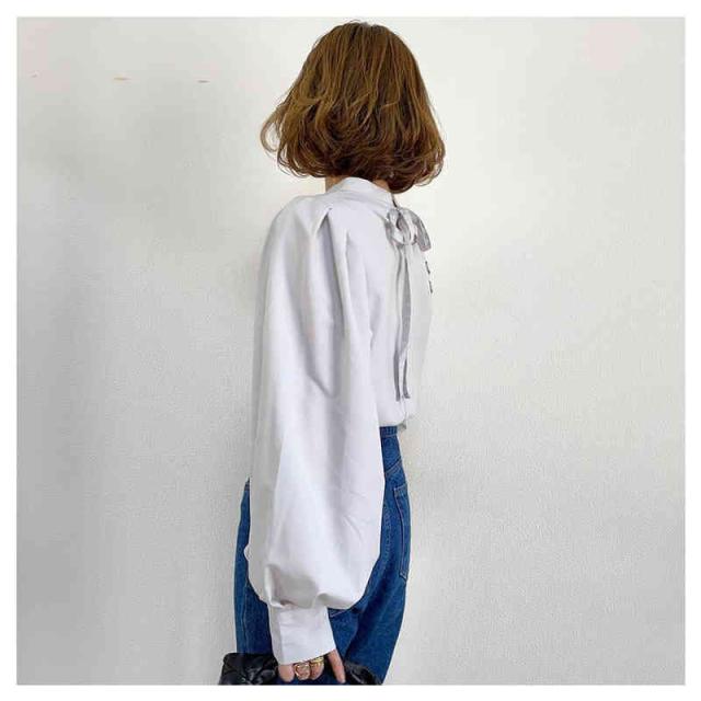 送料無料 ブラウス レディース トップス 白シャツ 白ブラウス 長袖 丸衿 無地 羽織り バックリボン 綿 コットン 大きいサイズ ゆったり ビッグシルエット スタンダード 丸襟シャツ オフィス 白 黒 春 夏 秋