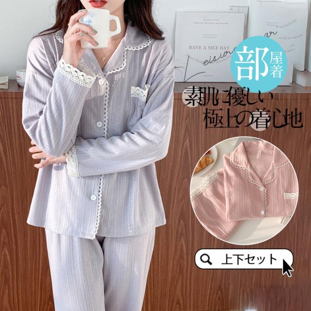 【水曜日まで!10%クーポン配布中】 ルームウエア パジャマ レディース 夏 部屋着 綿 前開き 長袖 セットアップ 夏パジャマ 肌触り コンフォート カジュアル ナイ
