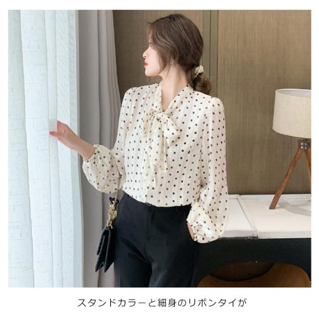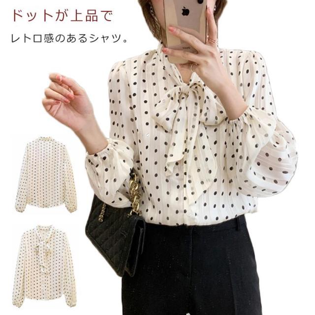 送料無料 レディース レトロ 長袖 水玉 ドット トップス シャツ ブラウス オシャレ リボン リボンタイ シフォン きれいめ 韓国 シンプル フリル 袖 リボン ボウタイ ホワイト 透け感 レディーミニン