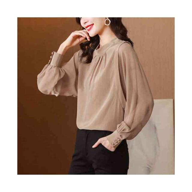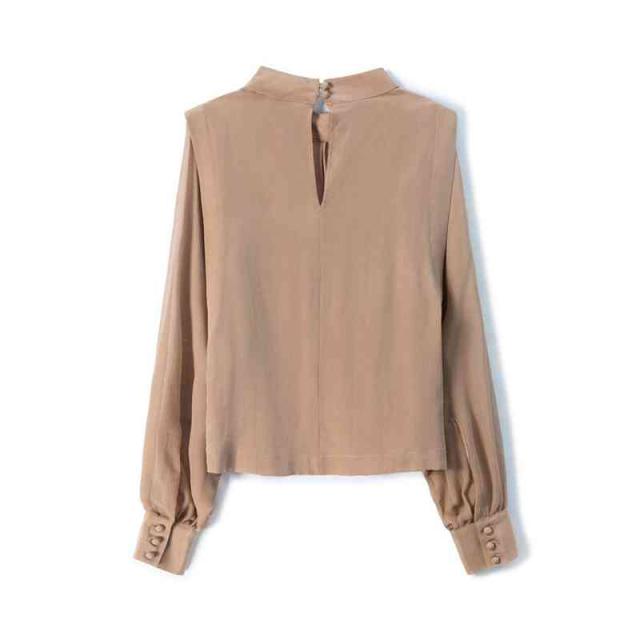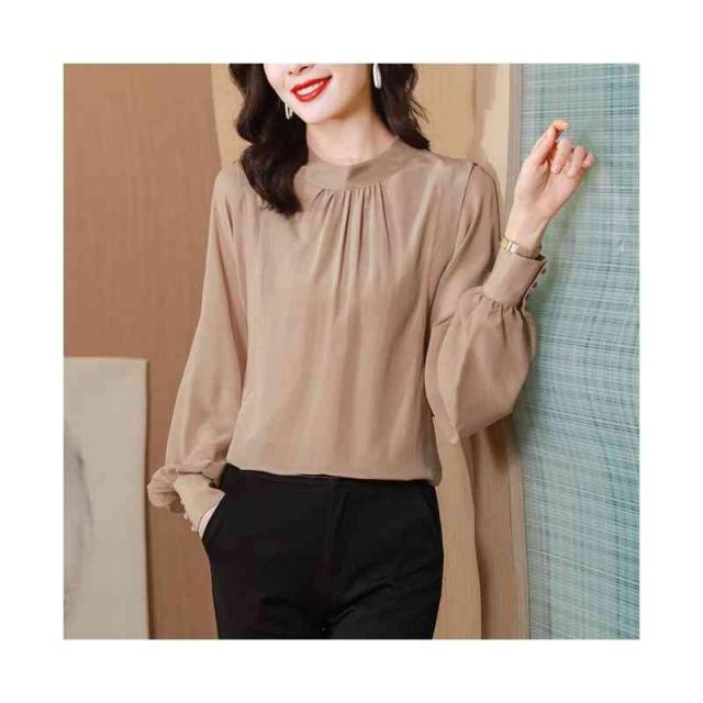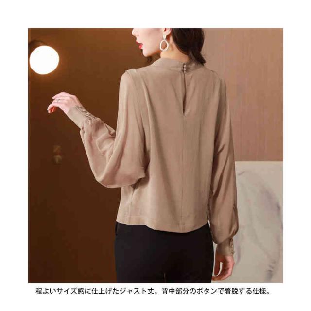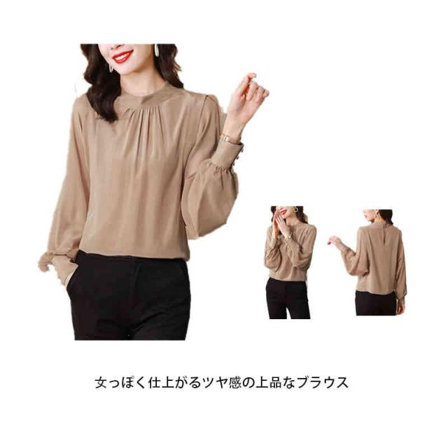 ブラウス バルーンスリーブ レディース 長袖 ボリューム袖 バルーン袖 スタンドカラー ギャザー とろみ 光沢感 背中ボタン シャツ トップス 春 秋 キレイめ 無地 艶 入学式 卒園式 ママコーデ 滑らか 落ち感 OL