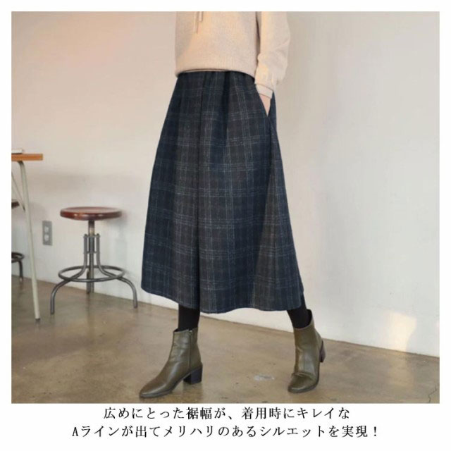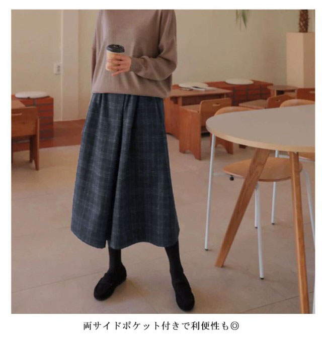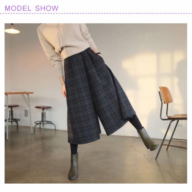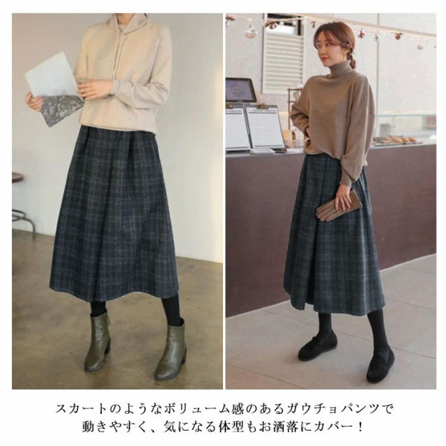 ガウチョパンツ ウール調ワイドパンツ レディース 女性 ワイドパンツ チェック柄 9分丈 ウールタッチ ウエストゴム ポケット付き 体型カバー 大人かわいいオフィスカジュアル 楽ちん ゆったり 秋 冬