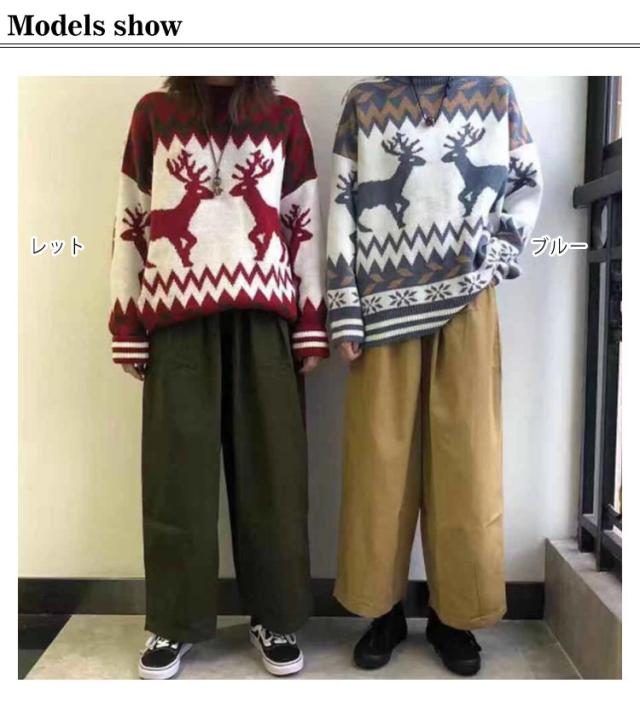 | 視線が集まるトナカイ柄ノルディックセーターです。 しっかりした比較的厚手の素材感。秋冬に適した生地です。 S M L XL 2XLの幅広サイズ展開で、男女兼用です。 | |
