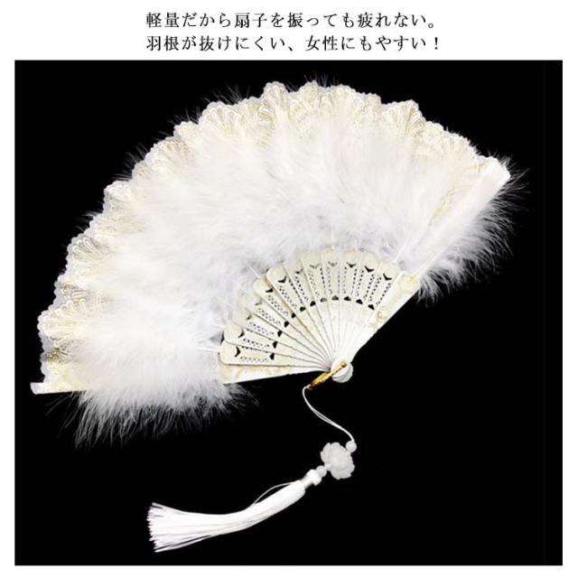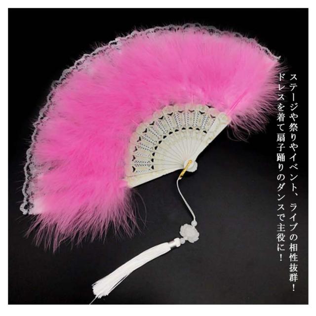 | ダンスの舞台演出にピッタリなとてもふわふわした羽のついたレース扇子です。 軽量だから扇子を振っても疲れない。羽根が抜けにくい、女性にもやすい! 見た目も華やかで練習から気分の上がる、とっておきのアイテムです!! ステージや祭りやイベント、ライブの相性抜群!ドレスを着て扇子踊りのダンスで主役に! 忘年会・新年会・イベントの余興アイテムに! | |