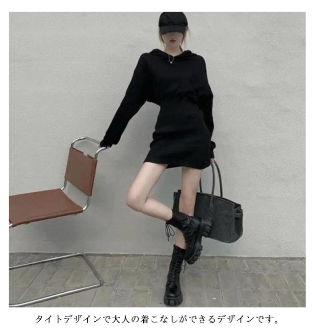 パーカーワンピース タイトワンピース 裏起毛 ミニ丈 長袖 ロングパーカー プルオーバーパーカー フード付き カジュアル 着?せ 腰がくびれデザイン レイヤード 通勤 通学 シンプル ブラック S M L XL
