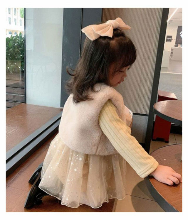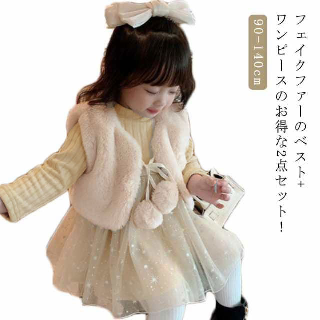 | フェイクファーのベスト+ワンピースのお得な2点セット! お誕生日や結婚式、入園式、卒園式、七五三、ご旅行、パーティーなどの子供用ドレス・プリンセスドレスとして人気です。 お出かけ、ご旅行、発表会、ダンス衣装などにも使えるかわいい子供用ドレス♪ カジュアルにもフォーマルにもおすすめ。 トップスは伸縮性のあるカットソー。 裏が起毛しているので1枚でも暖かいです。 スカート部分はキラキラのラメ模様のチュールが可愛い★3枚仕立てできれいなボリュームがでます。 チュールの下は起毛素材のスカートなので暖かく肌に直接当たらないので子供でも安心です。 ウエスト部分はゴム入りなので、良く伸び着やすく楽ちんです♪ ベストはふわふわの気持ちいい肌触りのフェイクファーのベスト。可愛いボンボンが特徴です。 ベストも裏起毛で暖かい。お手持ちの洋服と合わせてベスト単体でもお楽しみ頂けます。 ベストとワンピースが別々なので、それぞれお手持ちの洋服ともコーデをお楽しみ頂けます。 春先にはワンピース1枚で、冬にはカーディガンなどを合わせて、春秋冬と便利に使えるお得なアイテムです バースデイプレゼント ( バースデープレゼント )や、お子様、お孫さん、小学生、保育園、幼稚園生へのギフトやお祝い、贈り物として♪ | |