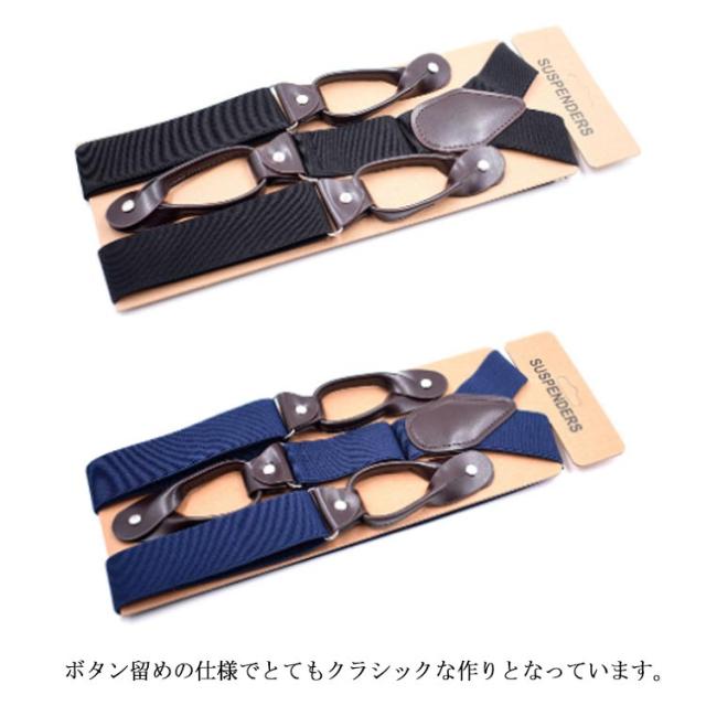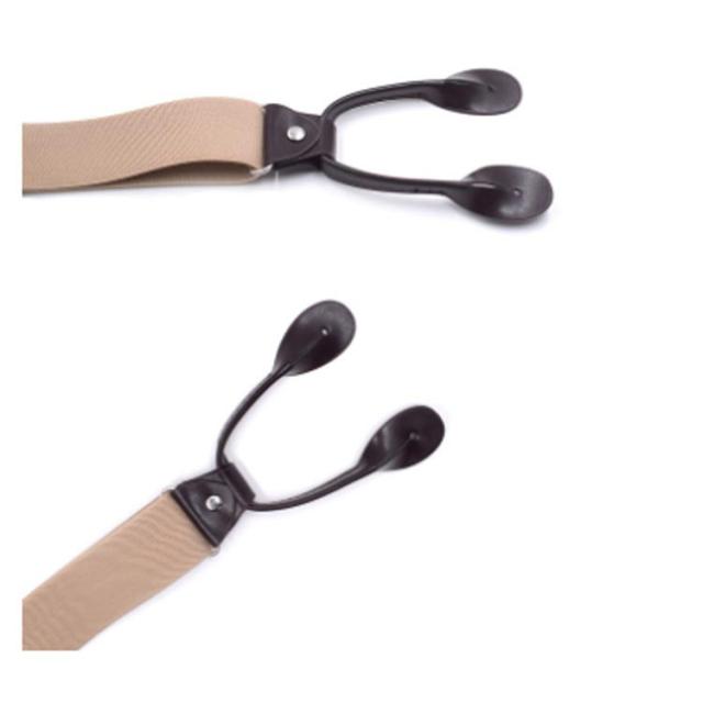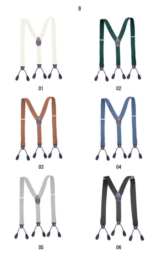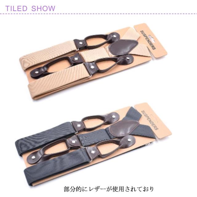 | 伸縮性に富んだラバー素材のY型サスペンダー 部分的にレザーが使用されており、 ボタン留めの仕様でとてもクラシックな作りとなっています。 | |