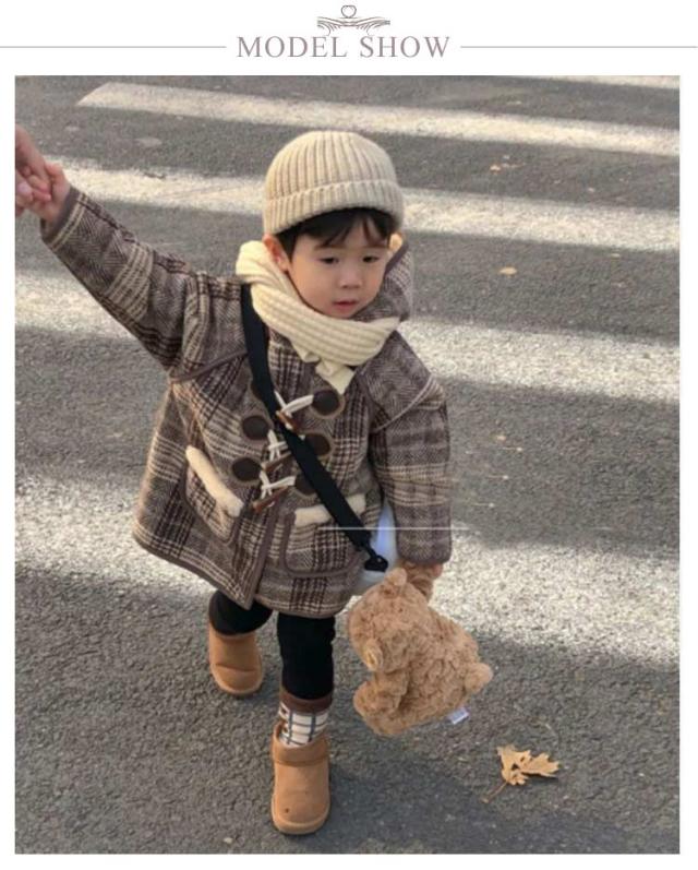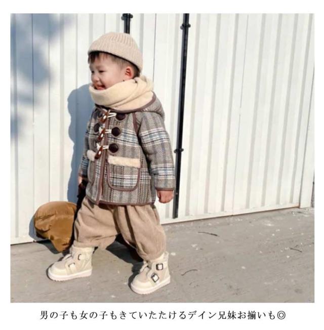 | フロントのトグルボタンがアクセントになったチェック柄のダッフルコート。 もこもこふわふわ裏ボアで、とってもあたたかい。 男の子も女の子もきていたたけるデイン兄妹お揃いも◎ 季節の変わり目や寒い日の重わ着にもオススメ。 どんなスタイリングにも合わせやすく、デイリーからお出掛けまで幅広いシーンで活躍してくれるアイテムです。 | |