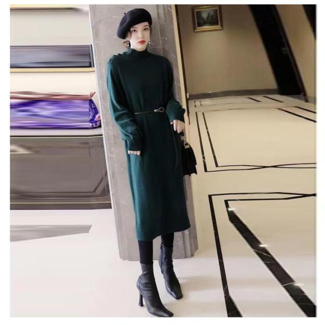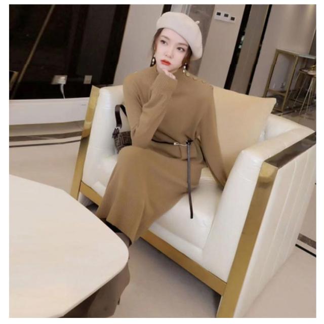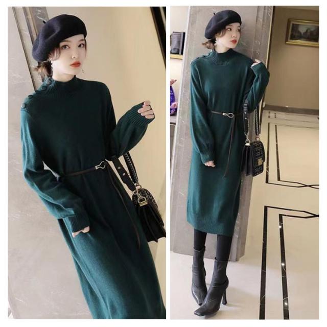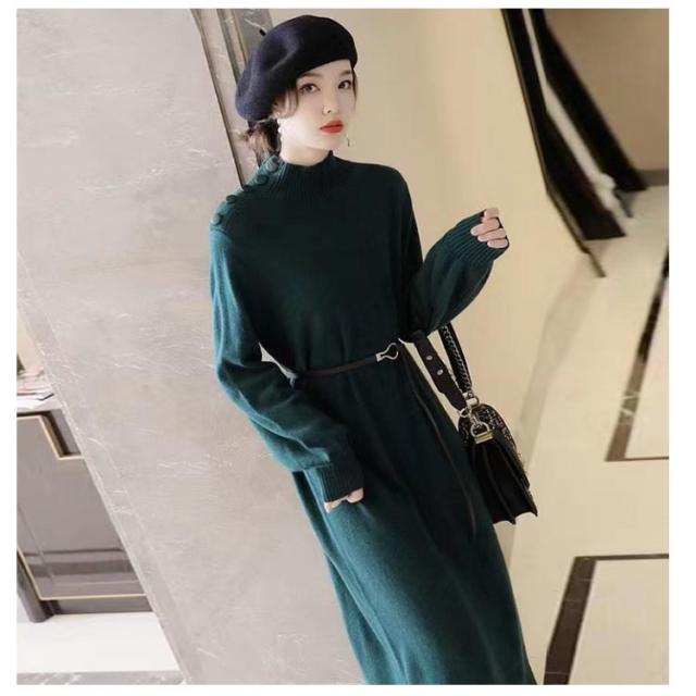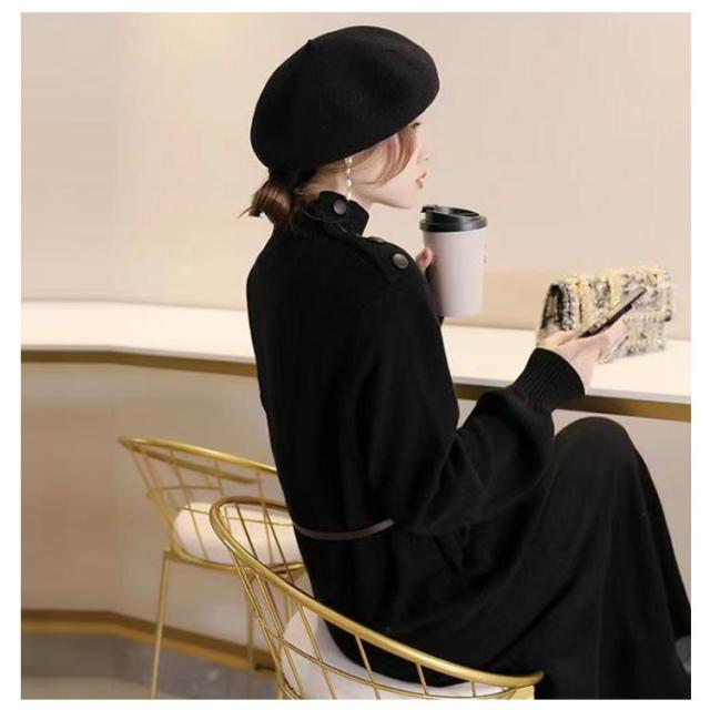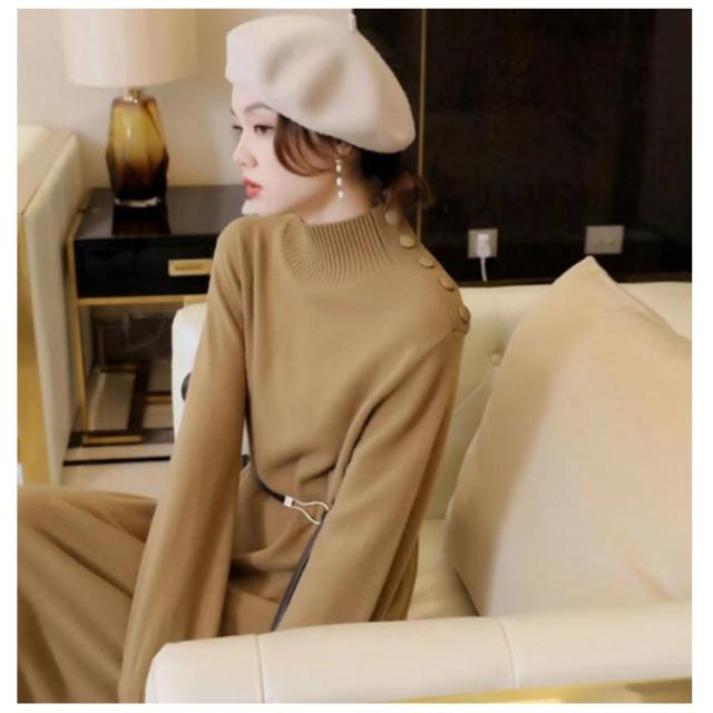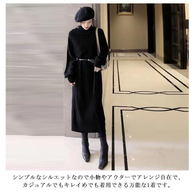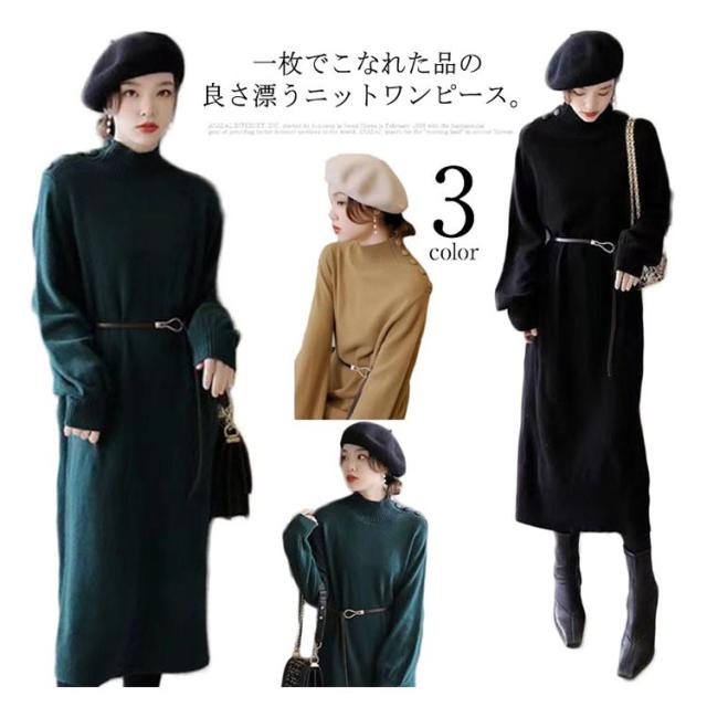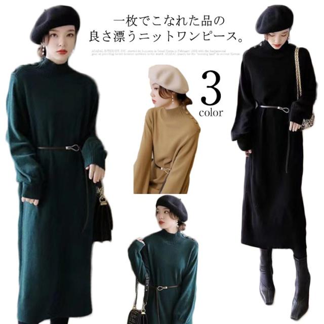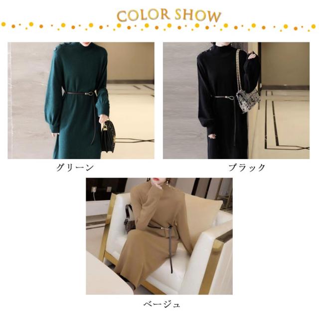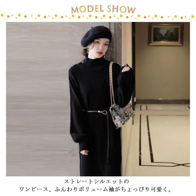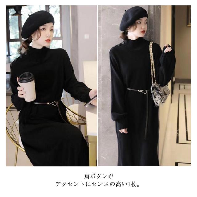 ワンピース 秋冬 きれいめ ロング ミモレ丈 ニットワンピース 肩ボタン ハーフネック 長袖 バルーンスリーブ 上品 韓国ファッション エレガント ロングワンピース 二次会 同窓会 女子会 デート