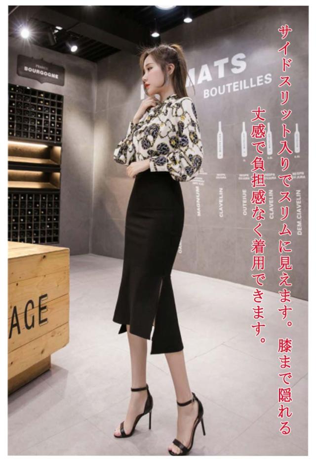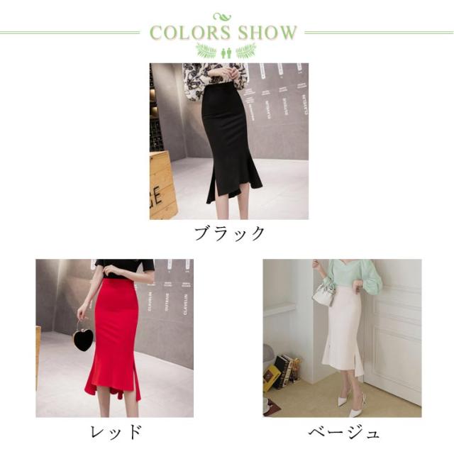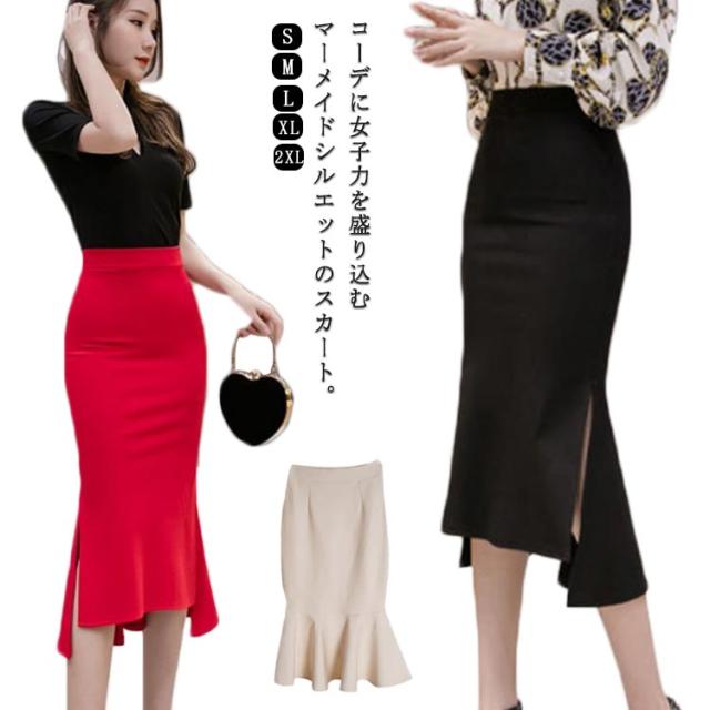 送料無料 マーメイドスカート タイトスカート ミモレ丈 ハイウエスト サイドスリット ヘムライン フリルヘム 伸縮性 らくちん 美シルエット スタイルアップ 体型カバー ボトムス 細見え ストレッチ 膝丈 通勤 OL 仕事 オフィス 上品