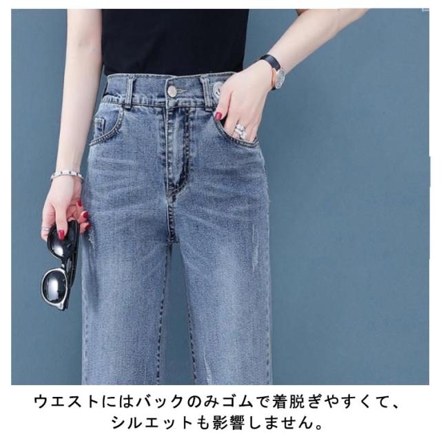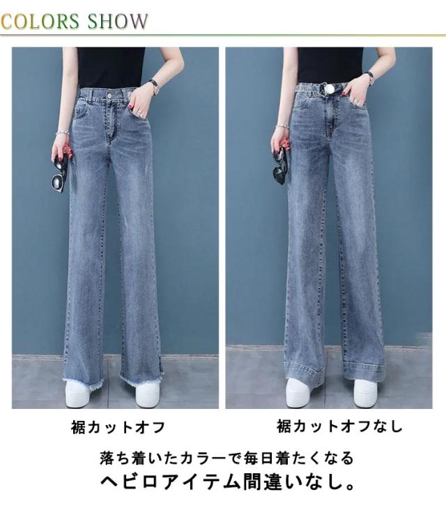 バックゴム デニムワイドパンツ ロング丈 デニムパンツ ワイド デニム ガウチョパンツ ジーンズ ハイウエスト 裾フリンジ カットオフ ボトムス パンツ ワイドパンツ キレイめ カジュアル 脚長 大きサイズ 送料無料