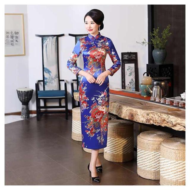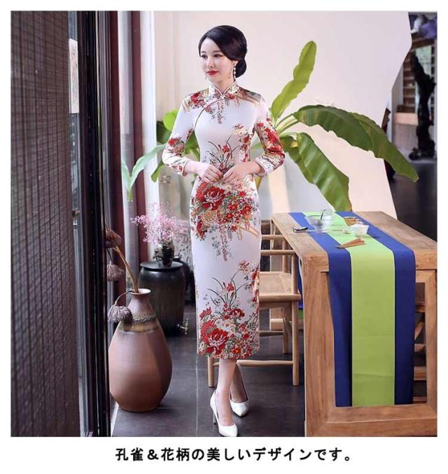 サイドスリット チャイナドレス ミモレ丈 ロング丈 ワンピース 優雅 セクシー 七分袖チャイナドレス パーティードレス エレガント レトロ 花柄 二次会 パーティー お呼ばれ 演奏会 発表会 披露宴 同窓会 S M L XL 2XL 3XL 4XL 5XL 6XL
