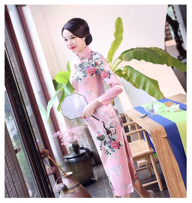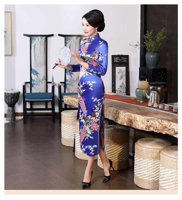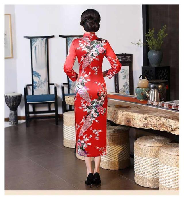 | ボディラインを美しく見せる、 大変綺麗なチャイナドレスです。 ロング丈にスリットで脚長効果抜群です。 孔雀&花柄の美しいデザインです。 | |