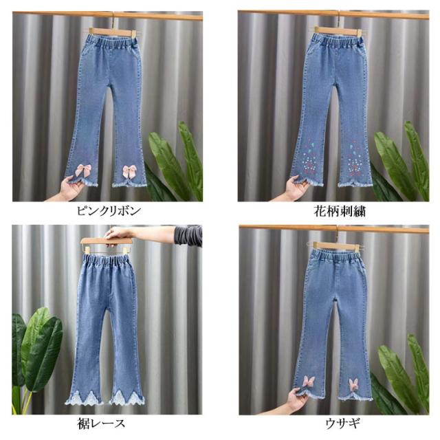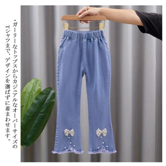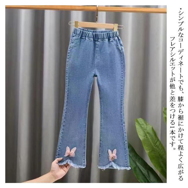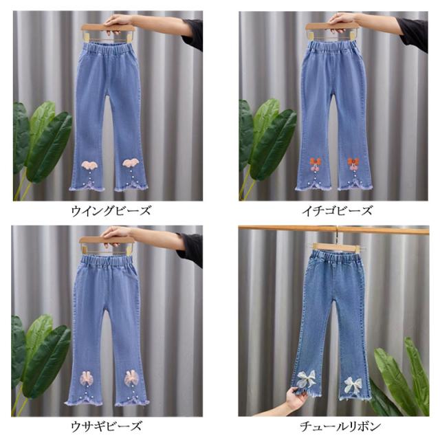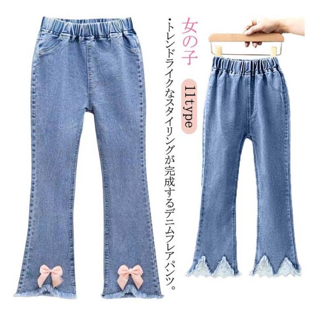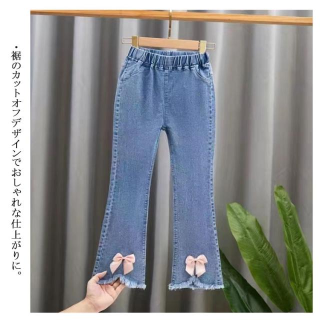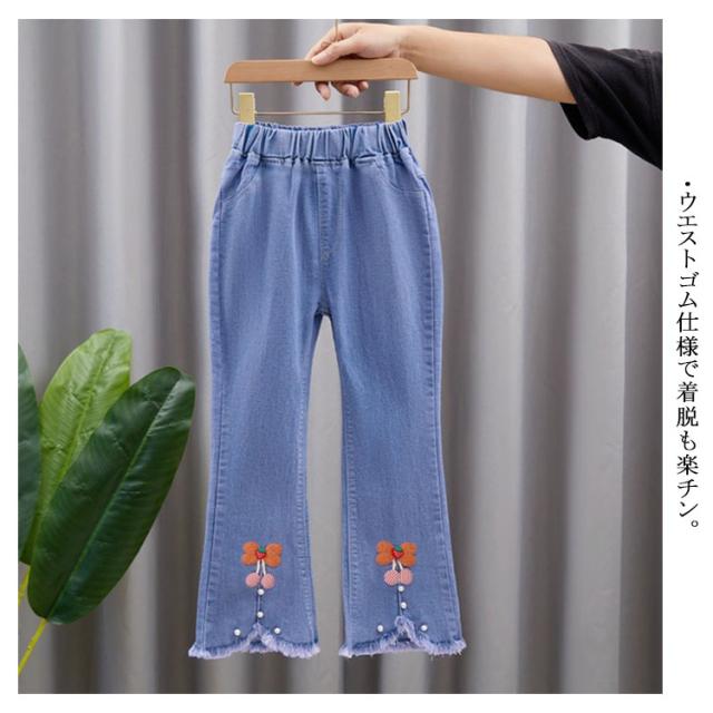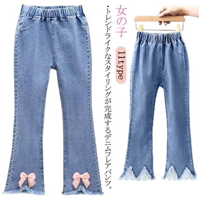 子供服 デニムパンツ フレアパンツ 女の子 ウェストゴム ストレッチ 裾カットオフデザイン バックポケット キッズ 女児 カジュアル 通園 通学 春 秋 全11柄