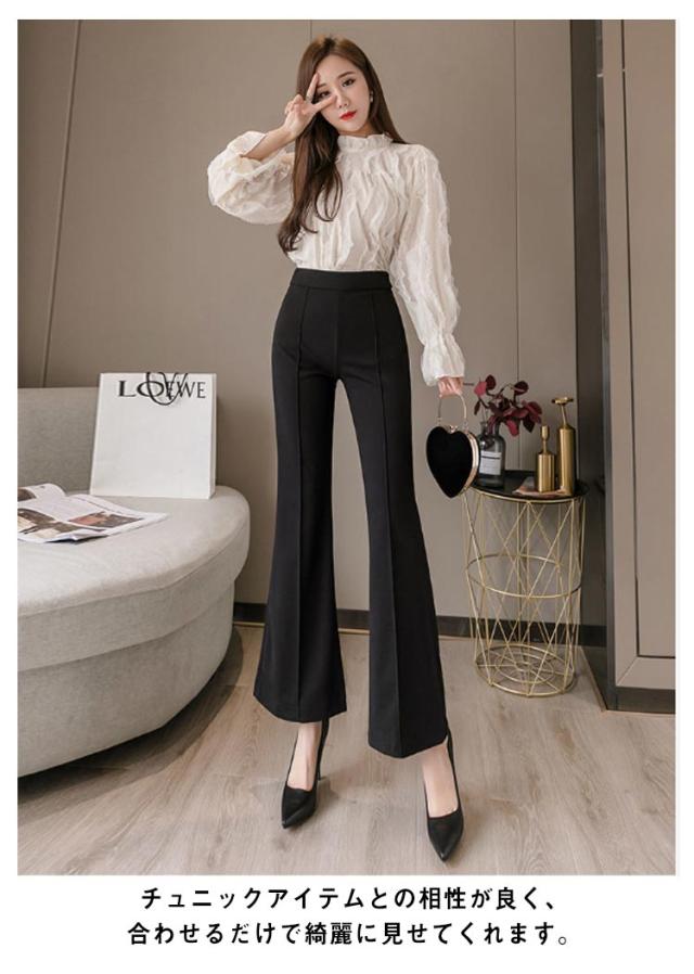 送料無料 ストレッチ フレアパンツ センタープレス ペンシルパンツ レディース パンツ スラックス 無地 ハイウエスト ウエストゴム ストレート ブーツカット ロングパンツ 美脚パンツ パンツドレス オフィスカジュアル 通勤