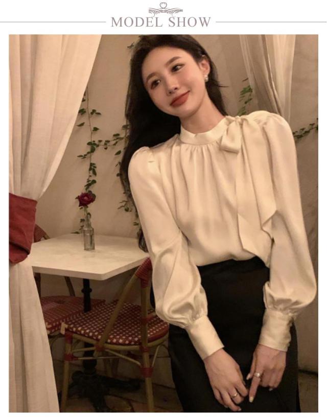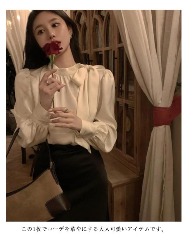 ボウタイ ブラウス レディース ネックリボン トップス ボリューム袖 長袖 白 フォーマルブラウス スーツ インナー 大人可愛い オフィス カジュアル 無地 ビジネス 通勤 入学式 卒園式 七五三 セレモニー 結婚式