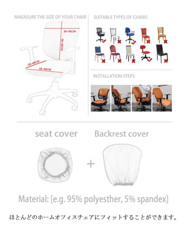 | 簡単着脱!ぴったりフィットなチェアカバー2点セット。 イスの模様替えや汚れ防止に最適。 ポリエステル繊維とスパンデックス生地を採用しており、柔らかく快適でしわになりにくいです。 伸縮性が優れ、取り付けや取り外しが簡単で、変形しにくいです。 ほつれなく、長くご愛用頂けます。 ほとんどのホームオフィスチェアにフィットすることができます。 | |