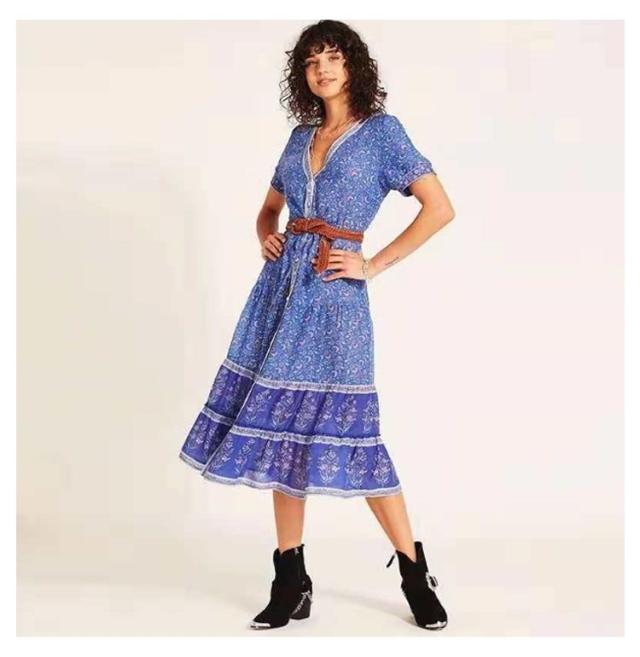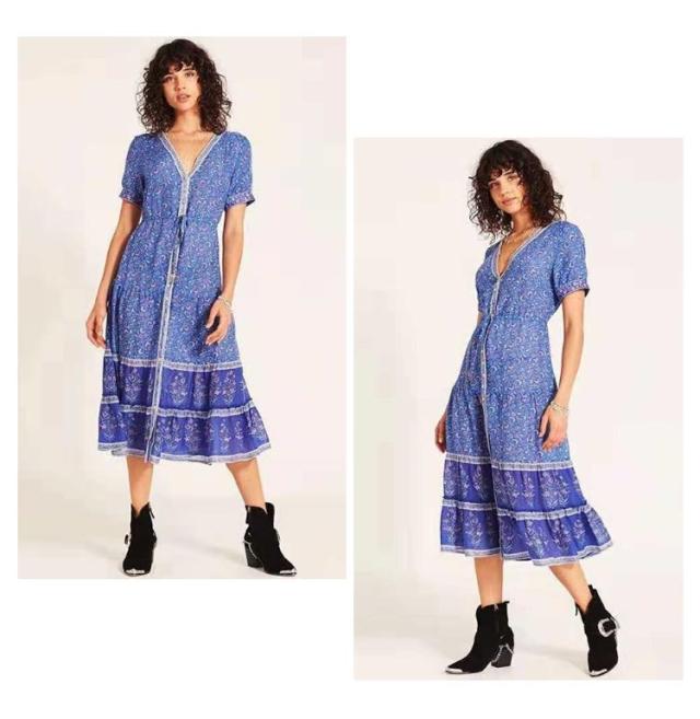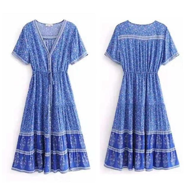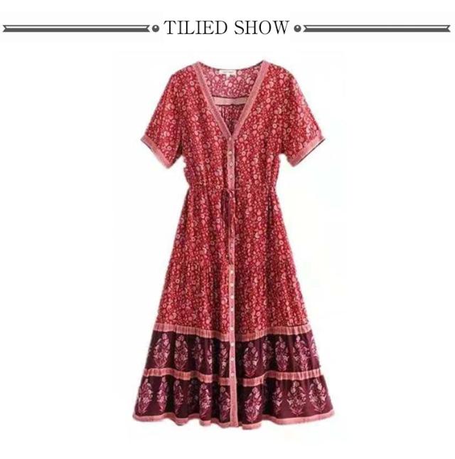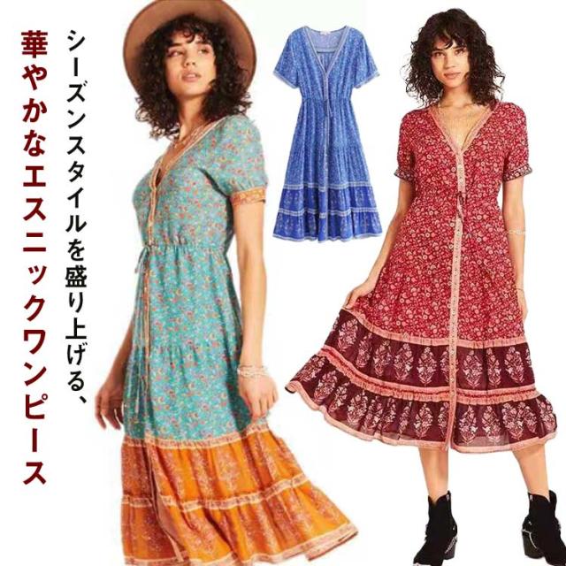 ワンピース レディース 半袖 Vネック ロング丈 ティアード切替 前開き ウェストドローストリング Aライン フロントボタン 総柄 花柄 リゾート きれい おしゃれ 海 ビーチ 夏 全3色