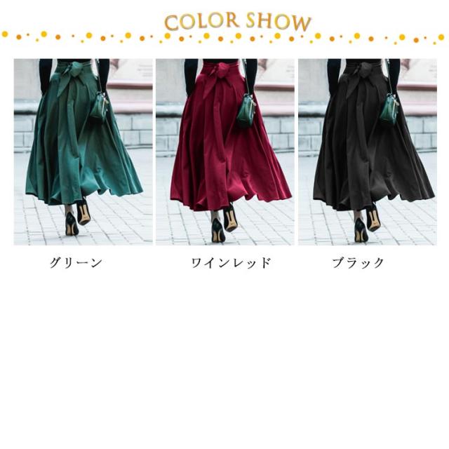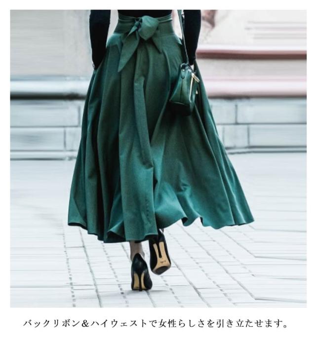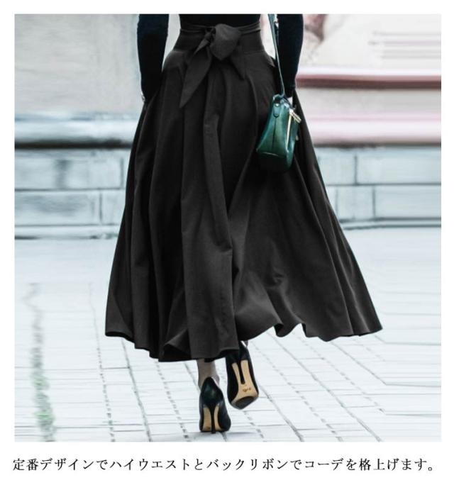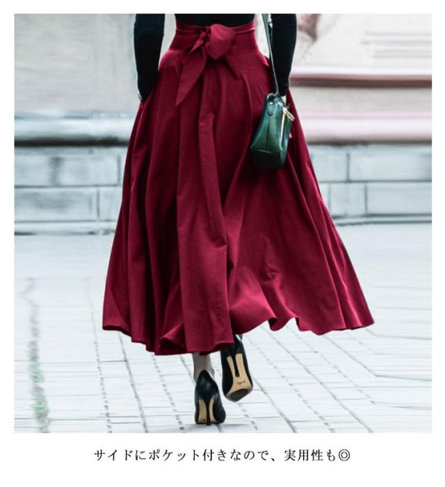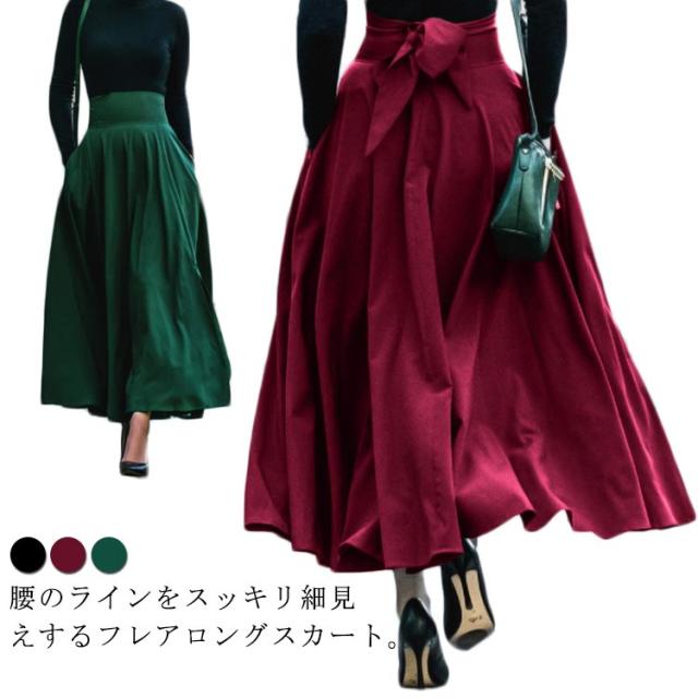 ロングスカート フレアスカート 無地 Aライン ふんわり レディース ポケット付き ハイウエスト バックリボン 送料無料 体型カバー 美脚 春夏 マキシスカート ロング丈 メリハリ