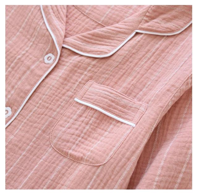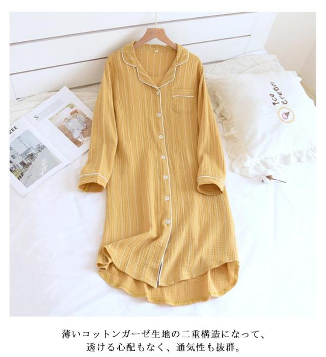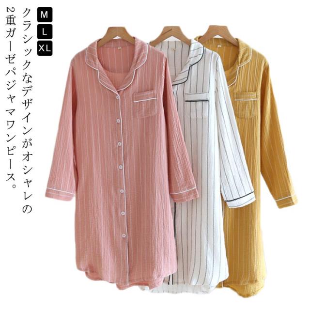 2重ガーゼ パジャマ ワンピース 長袖 コットン ルームワンピース 前開き ロングシャツ 部屋着 マタニティ ネグリジェ 送料無料 Wガーゼ ストライプ柄 春・夏・秋・冬 授乳服 妊婦服 ルームウェア ナイトウェア 寝巻き 入院